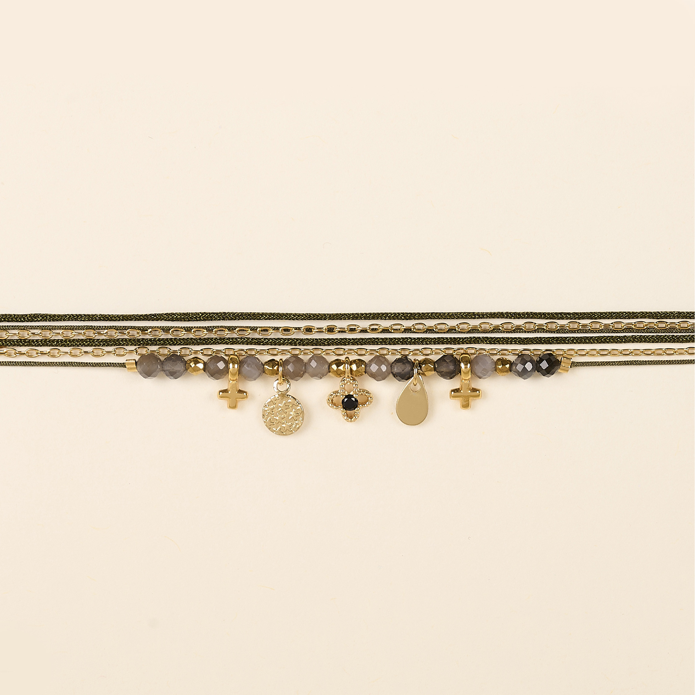Il associe délicate obsidienne facettée, perles en pierres fines de 3mm de diamètre et petites médailles et pendentif serti clos d'oxyde de zirconium.