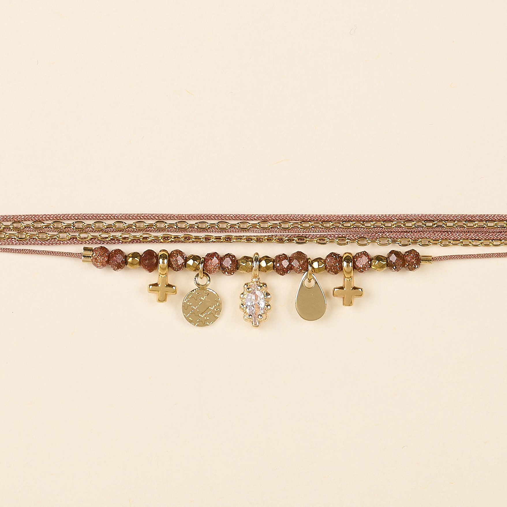 Il associe délicate goldstone facettée, perles en pierres fines de 3mm de diamètre et petites médailles et pendentif serti clos d'oxyde de zirconium.