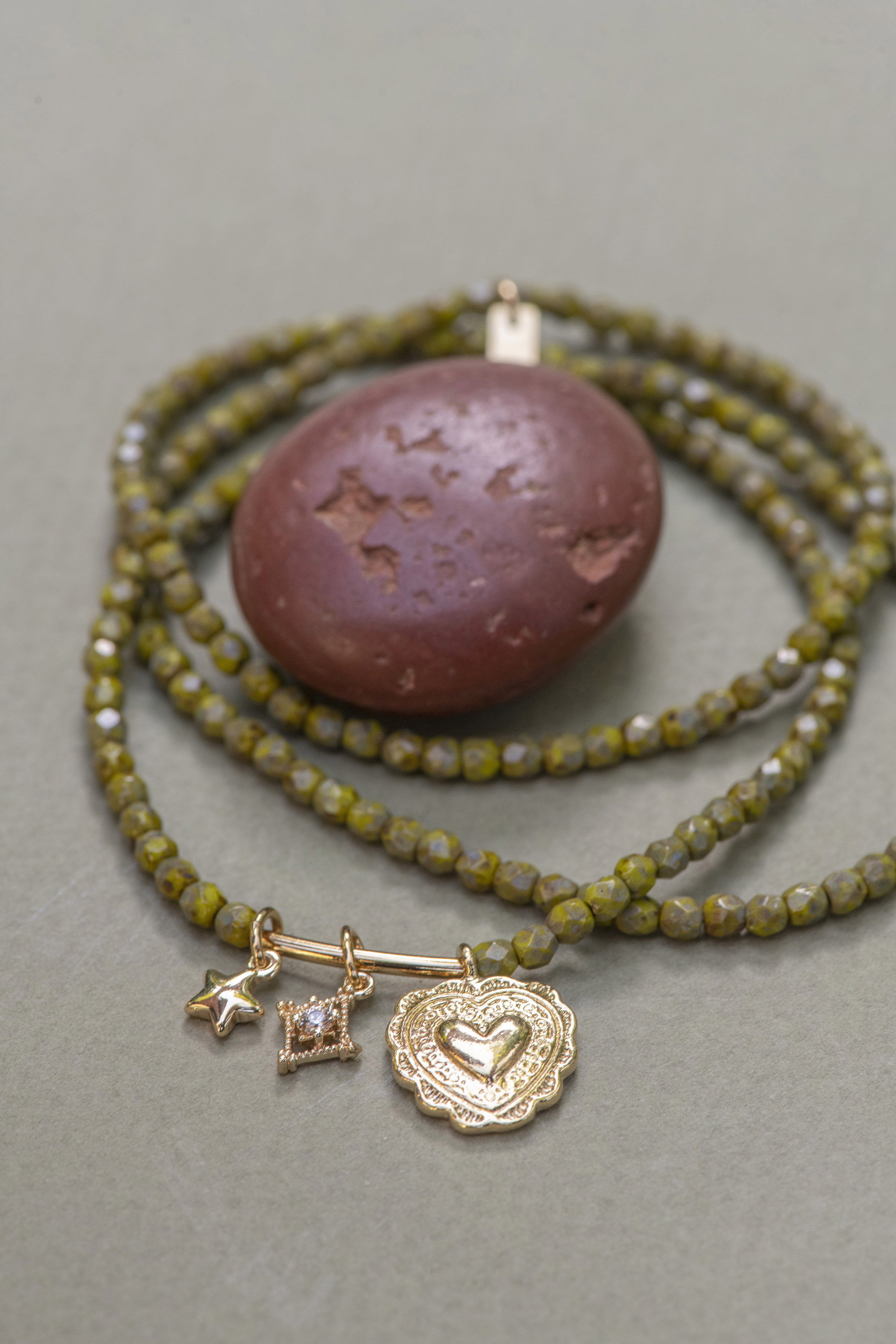 Au centre, une médaille gravée d’un cœur, un tube délicat et une petite médaille sertie d’un oxyde de zirconium apportent une touche lumineuse et symbolique à l’ensemble.