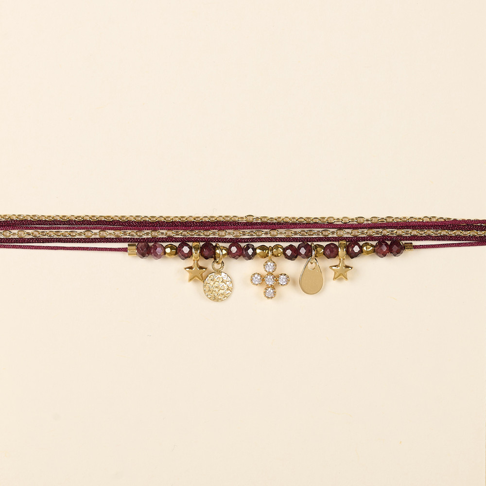 Il associe délicat grenat facetté, perles en pierres fines de 3mm de diamètre et petites médailles et pendentif serti clos d'oxyde de zirconium.