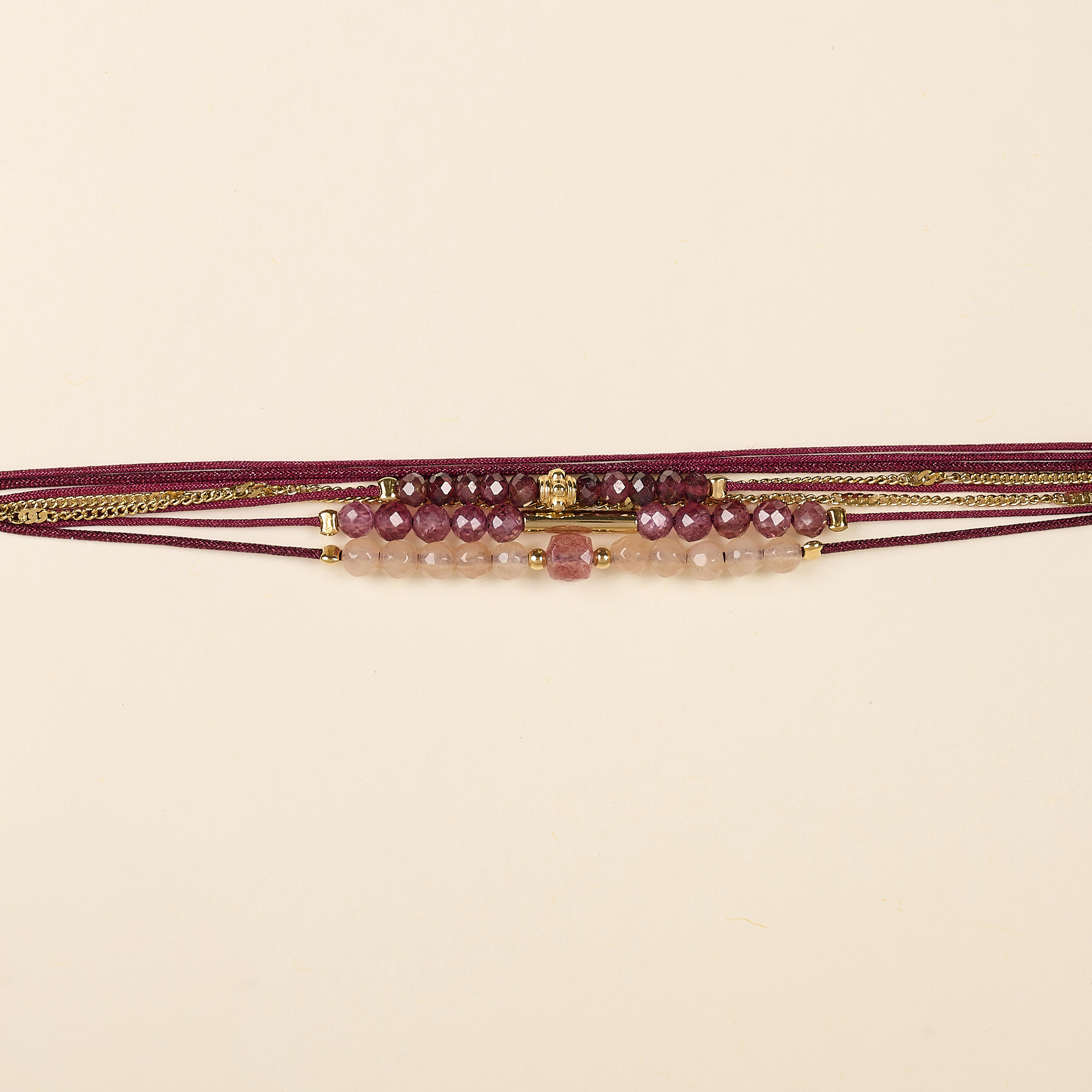 Il associe petites chaînes dorées et trois cordons sur lesquels se mélangent : pierre de lune pêche, grenat, quartz cherry.