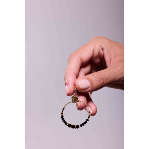 Les boucles d’oreilles Mali noir se composent d’un anneau doré de 3 cm de diamètre orné de perles en agate noire facettée. Elles sont réalisées en laiton doré à l’or fin 2 microns 24 carats et pierres naturelles.