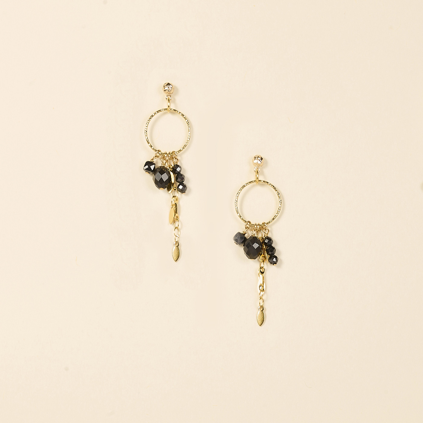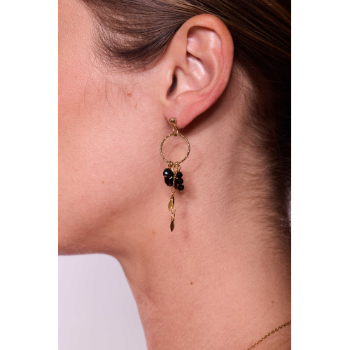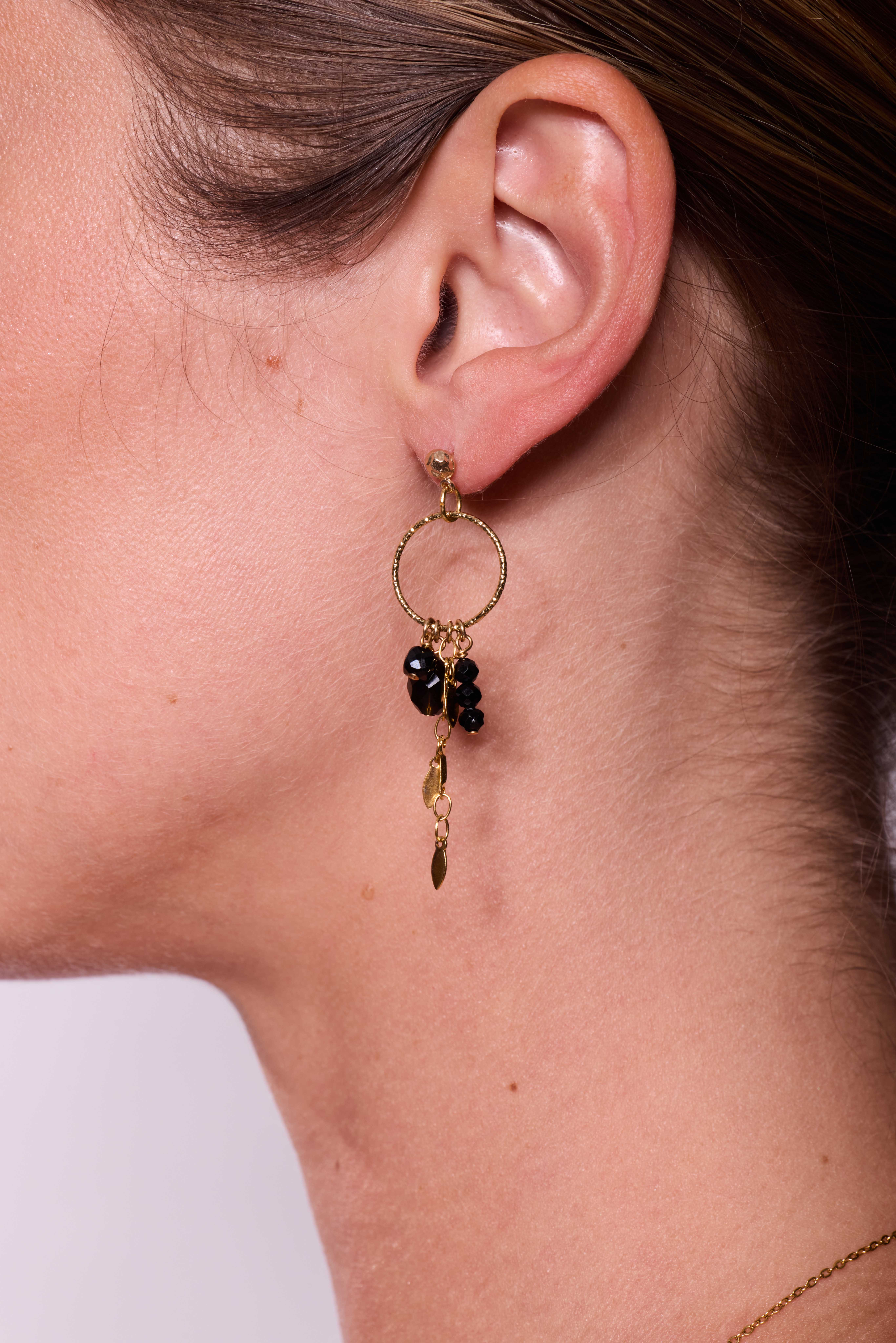 Boucles d’oreilles dorées à l’or fin ornées de grappes de perles facettées en agate noire suspendues à un petit anneau texturé.