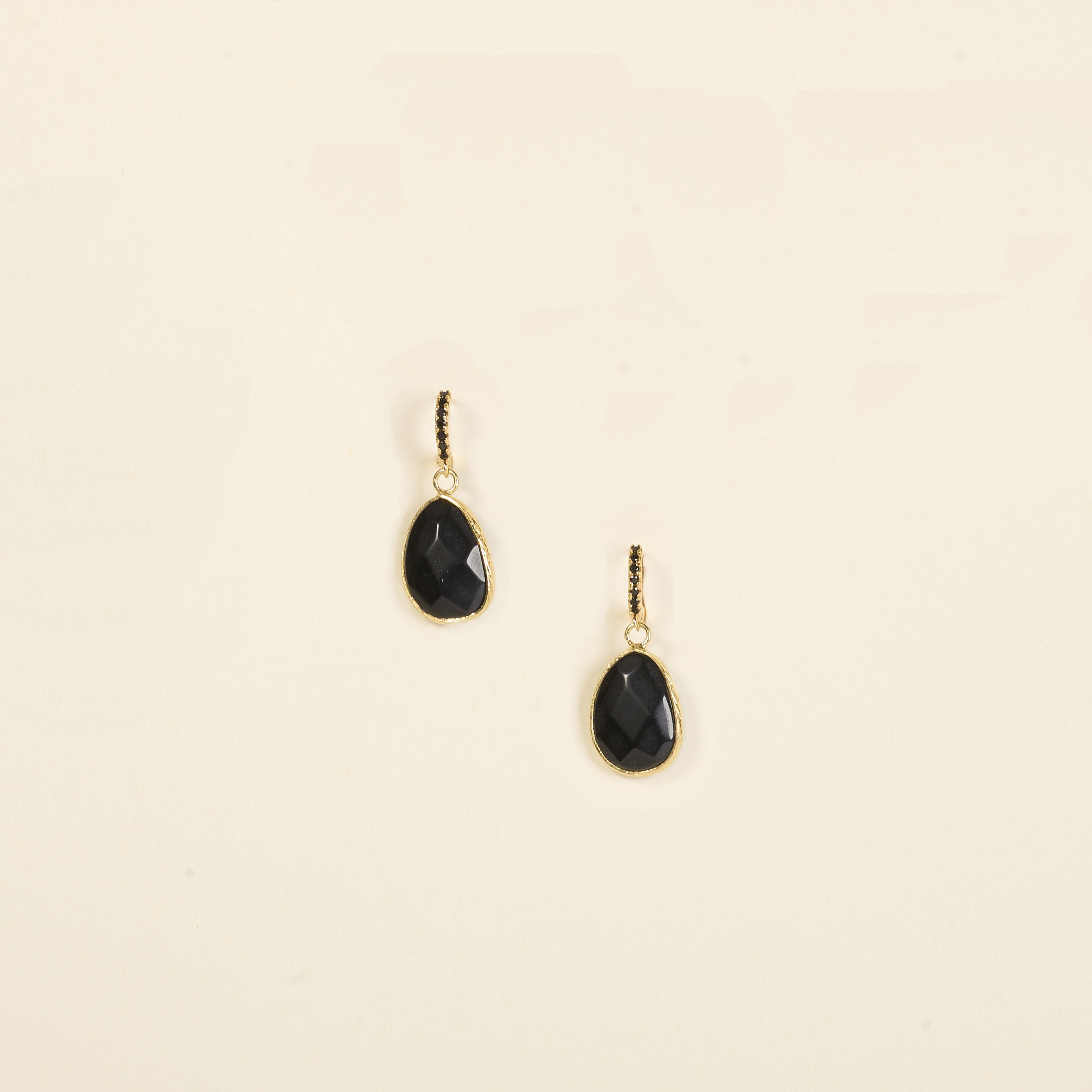 Les boucles d’oreilles Nino se composent d’un pendentif goutte en agate noire facettée, suspendu à un petit anneau serti de pierres noires.