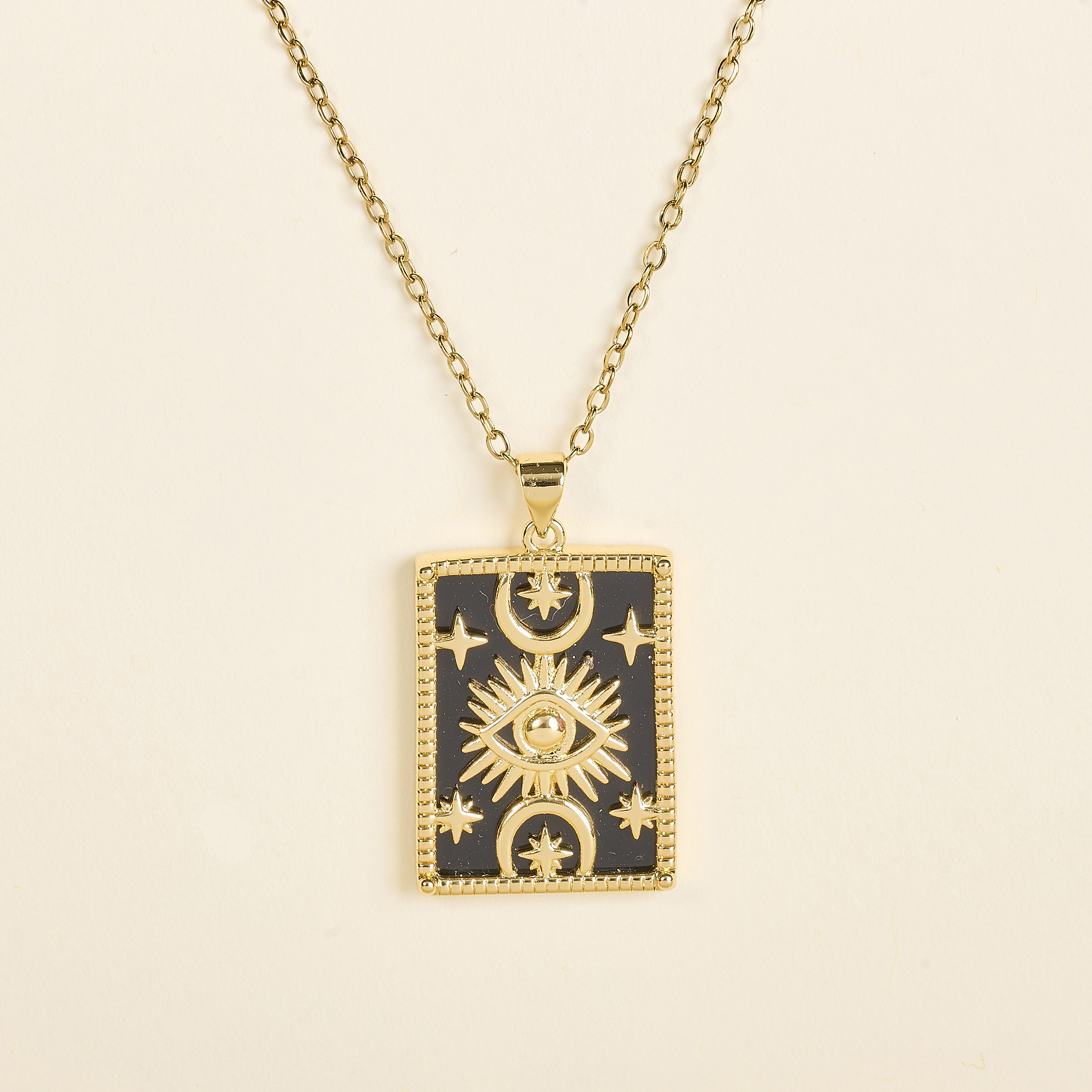 Collier en acier doré orné d’un pendentif rectangulaire représentant un œil entouré d’étoiles et de lunes.
