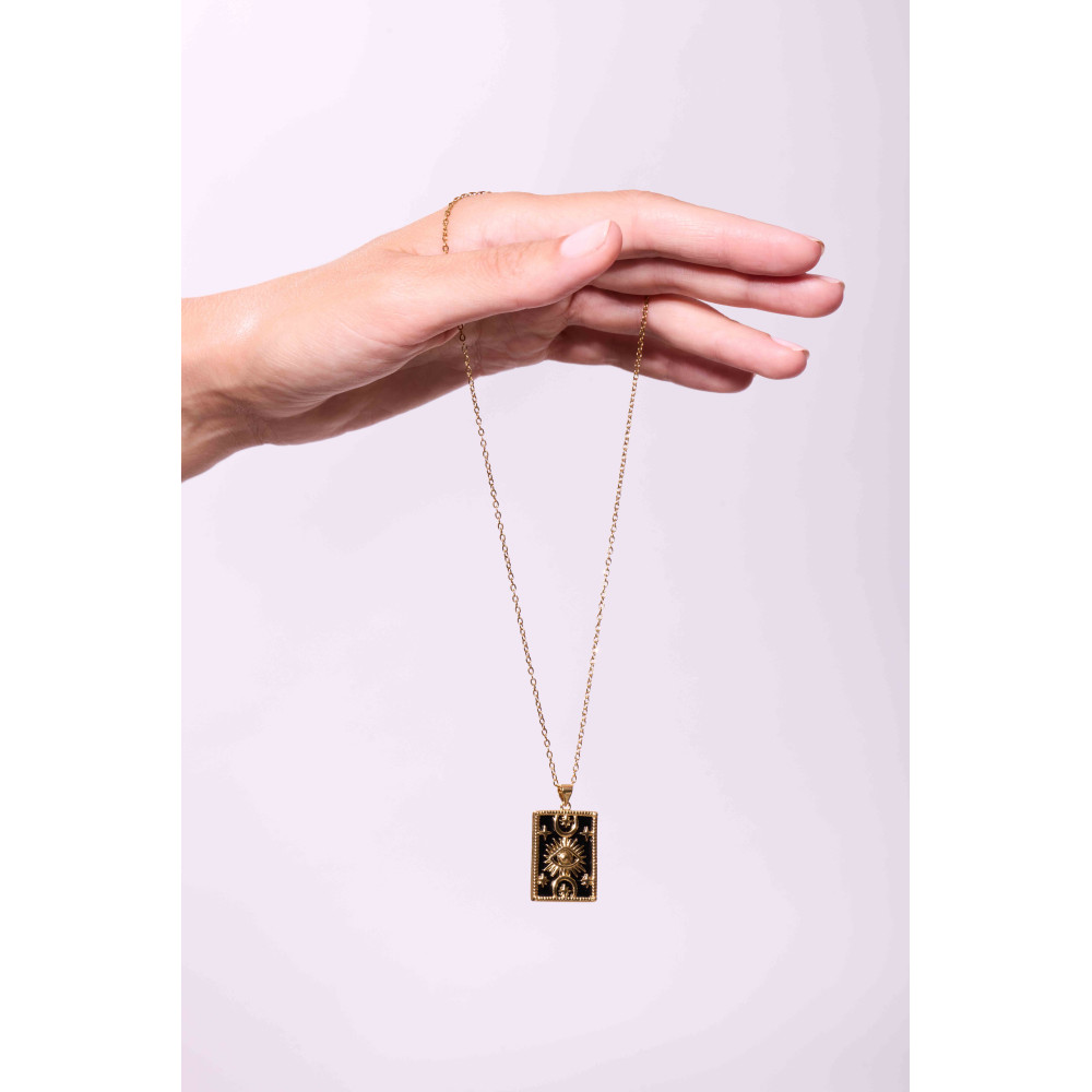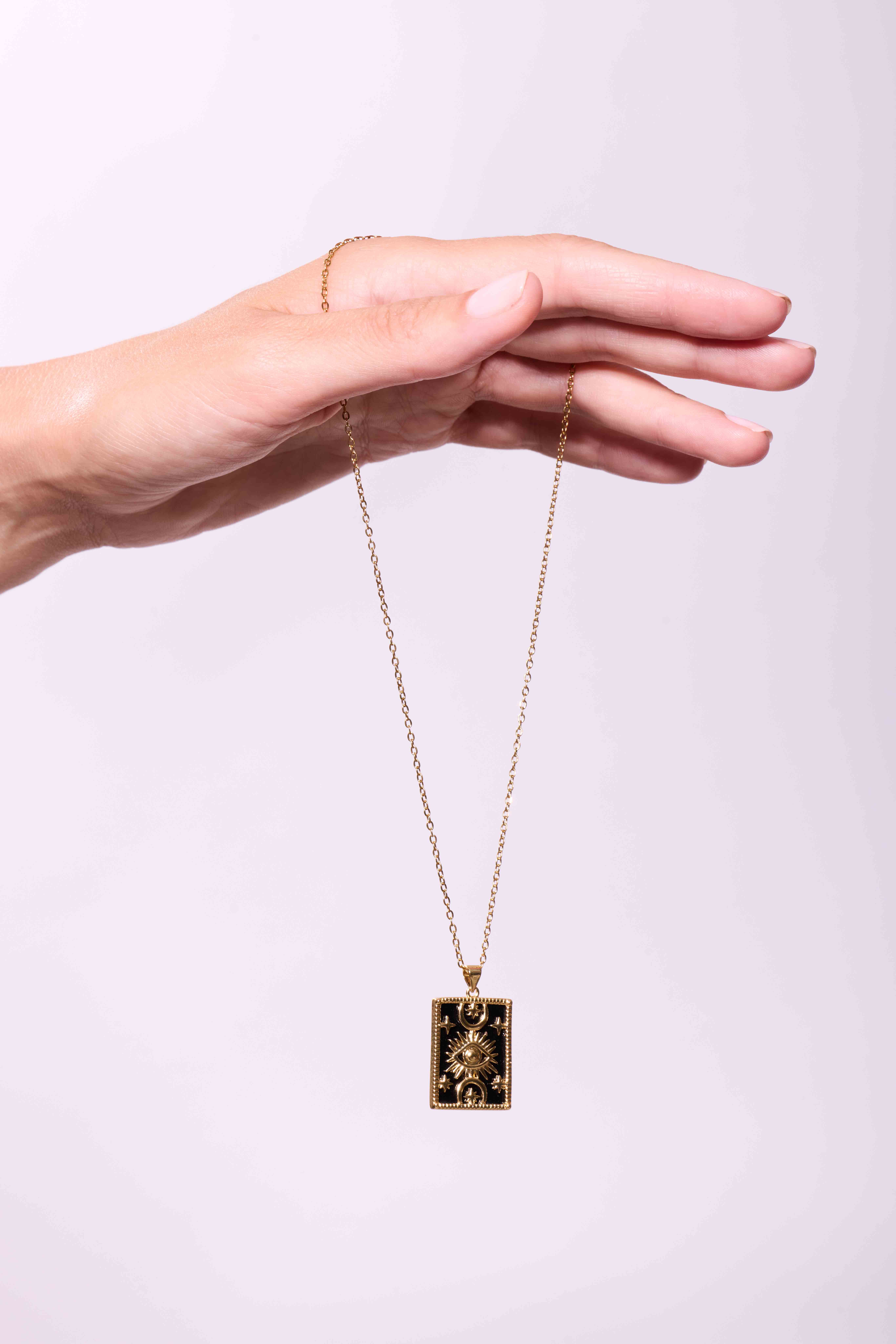 Collier en acier doré orné d’un pendentif rectangulaire représentant un œil entouré d’étoiles et de lunes.
