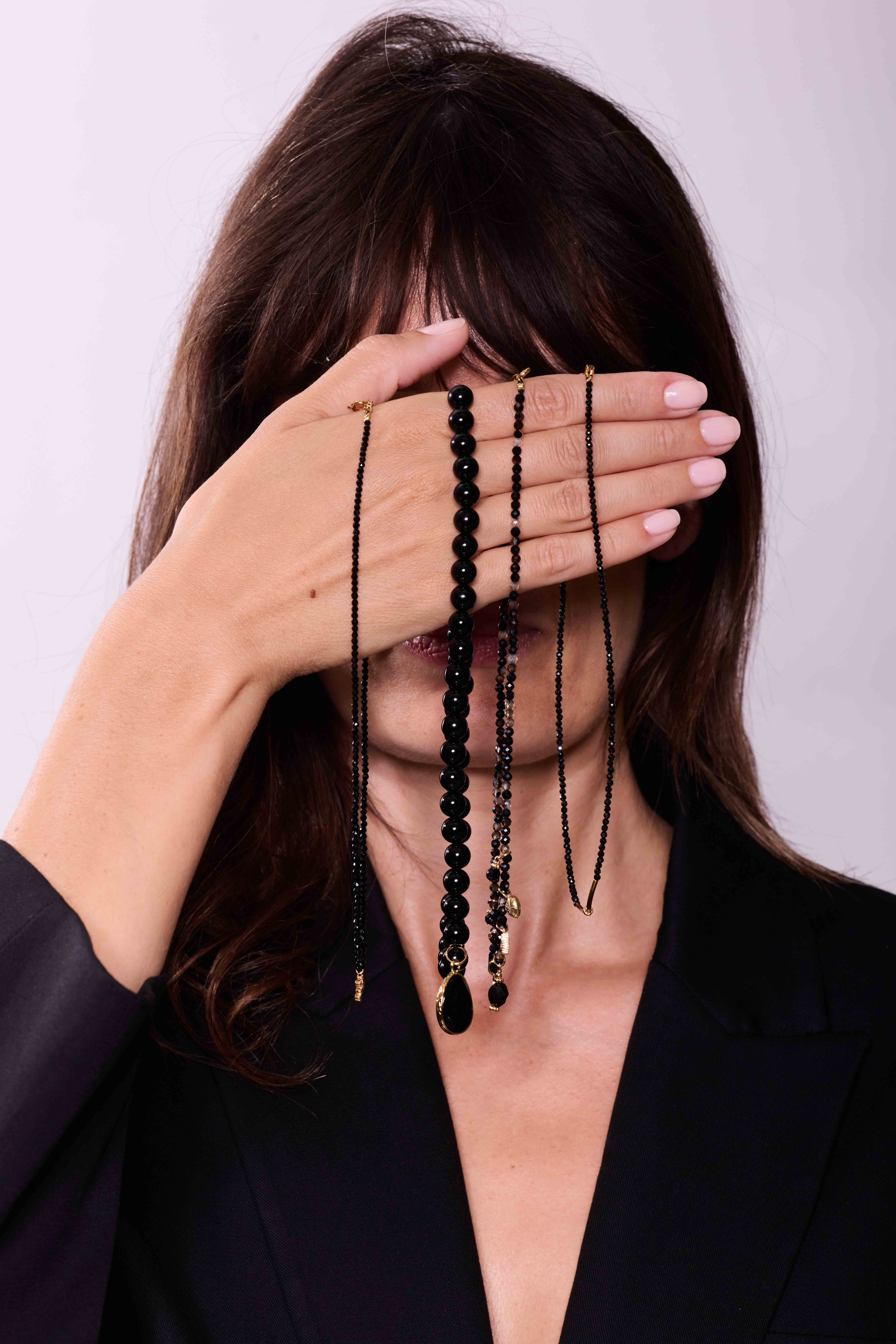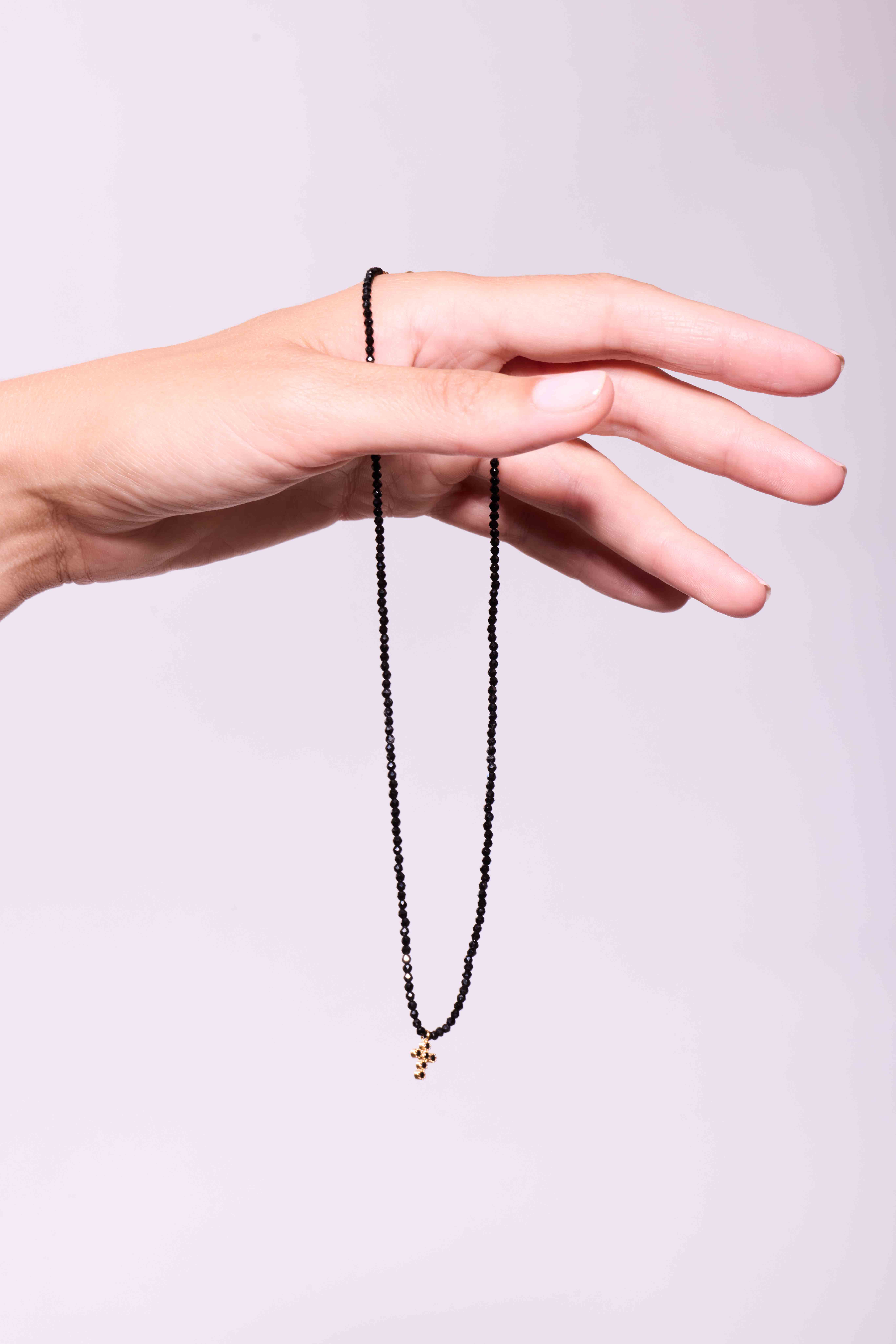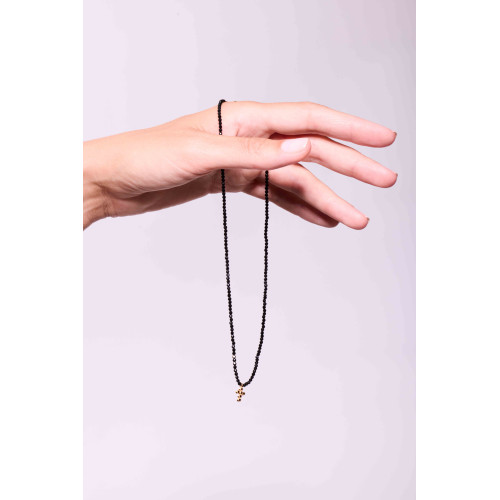 Avec ses perles facettées noires montées sur 37 cm, ce collier se distingue par son pendentif croix serti d’oxydes noirs, qui lui confère un charme à la fois mystique et moderne.