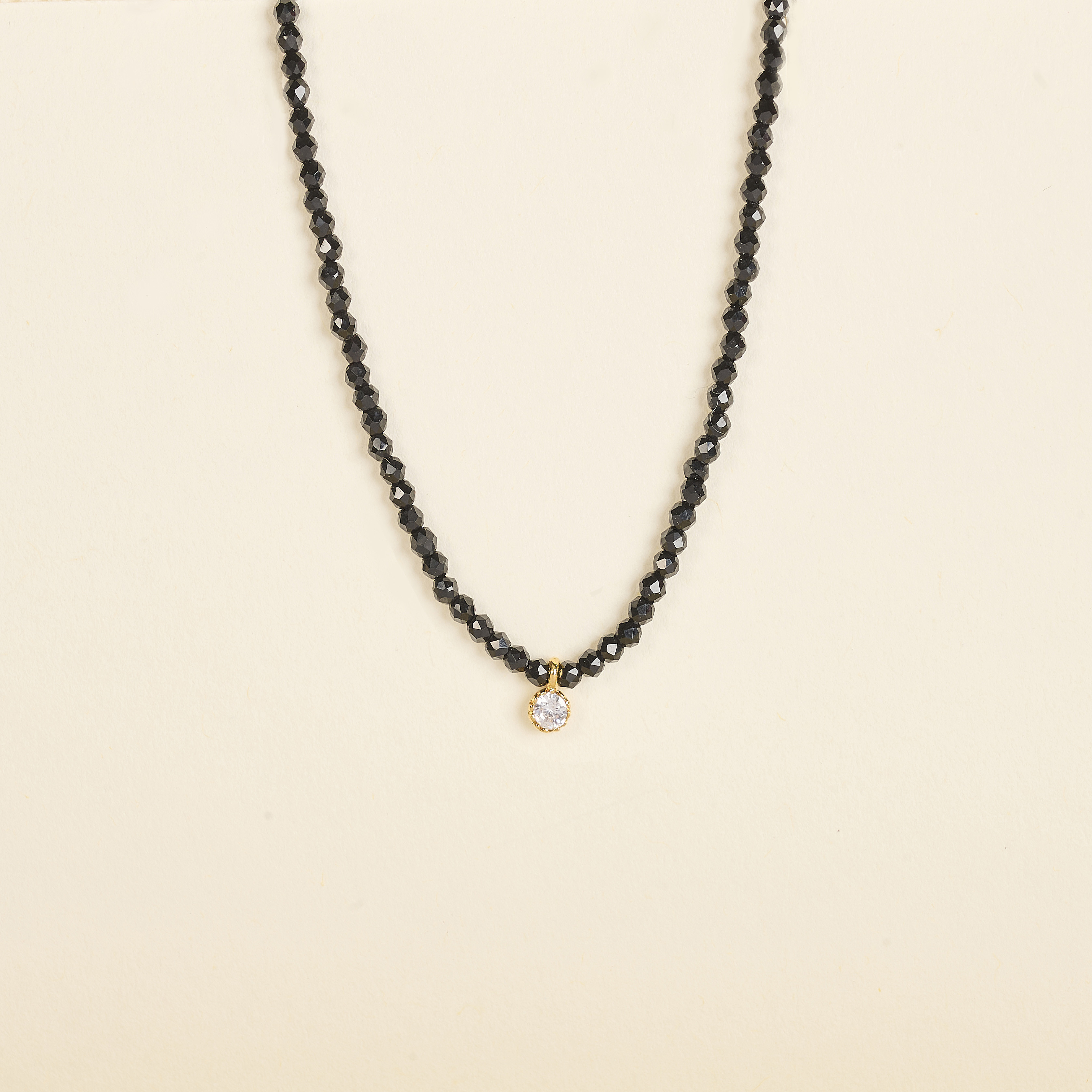 Un collier de 37 cm de longueur, orné de perles facettées noires et d’un pendentif rond serti d’un oxyde blanc étincelant.