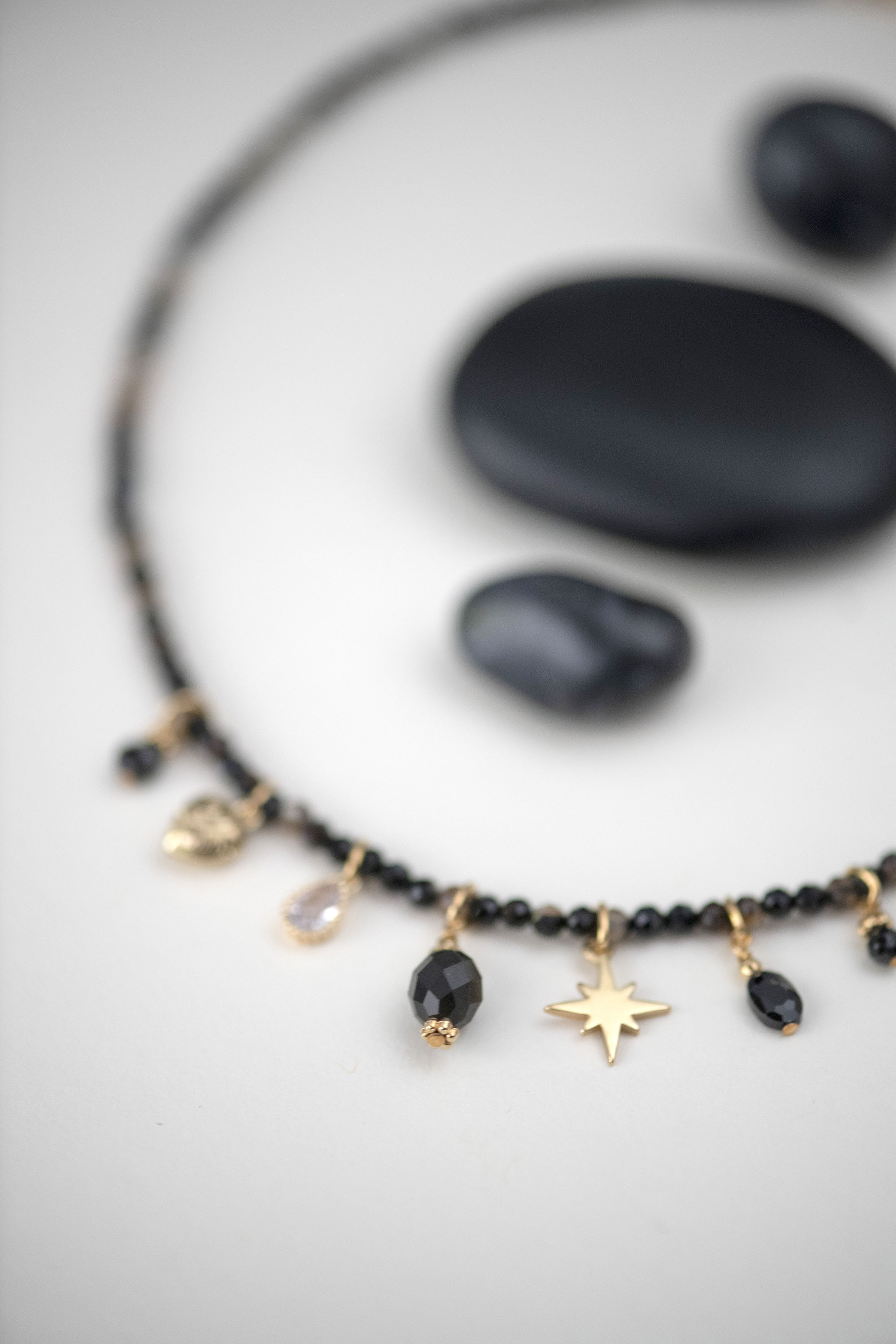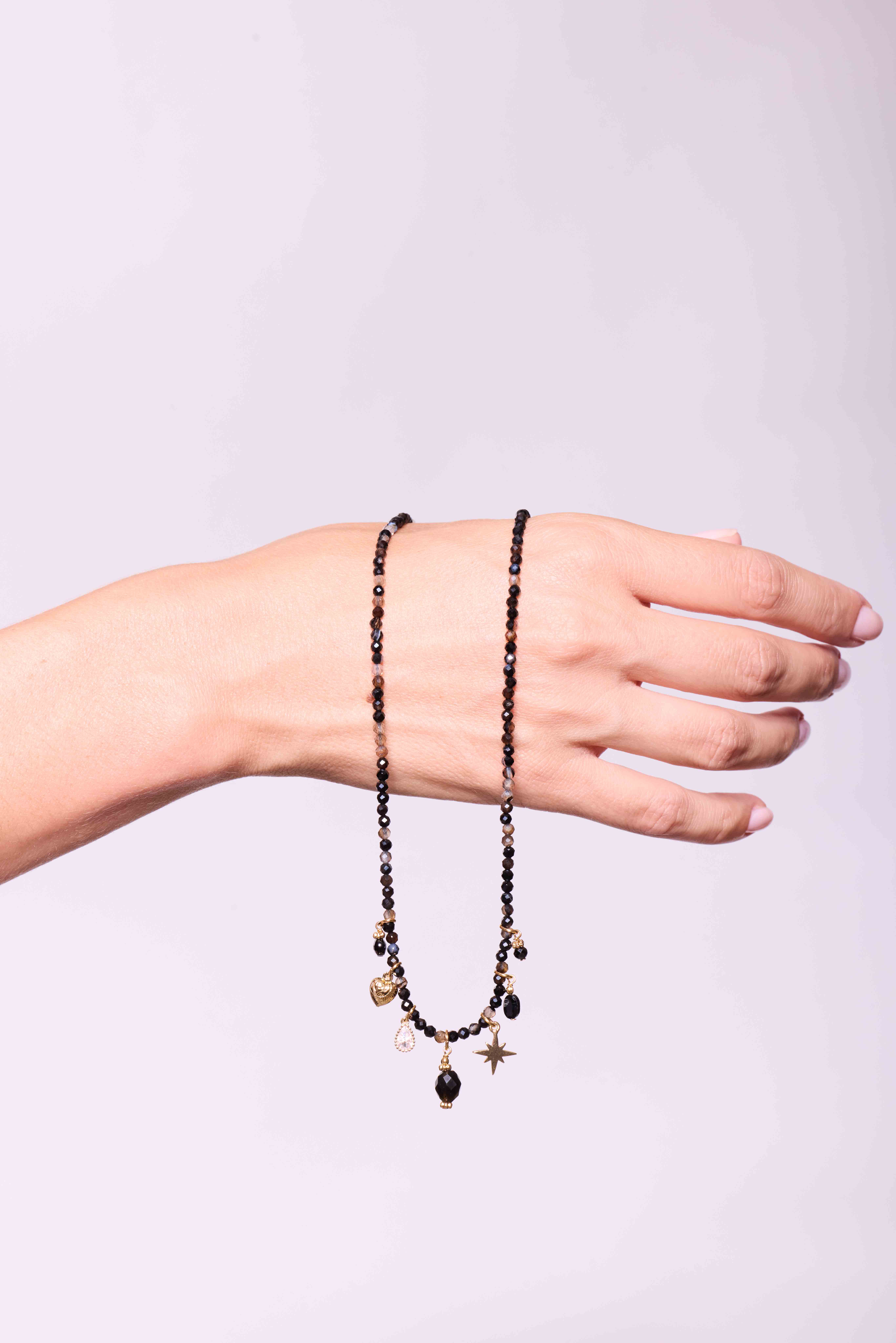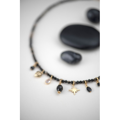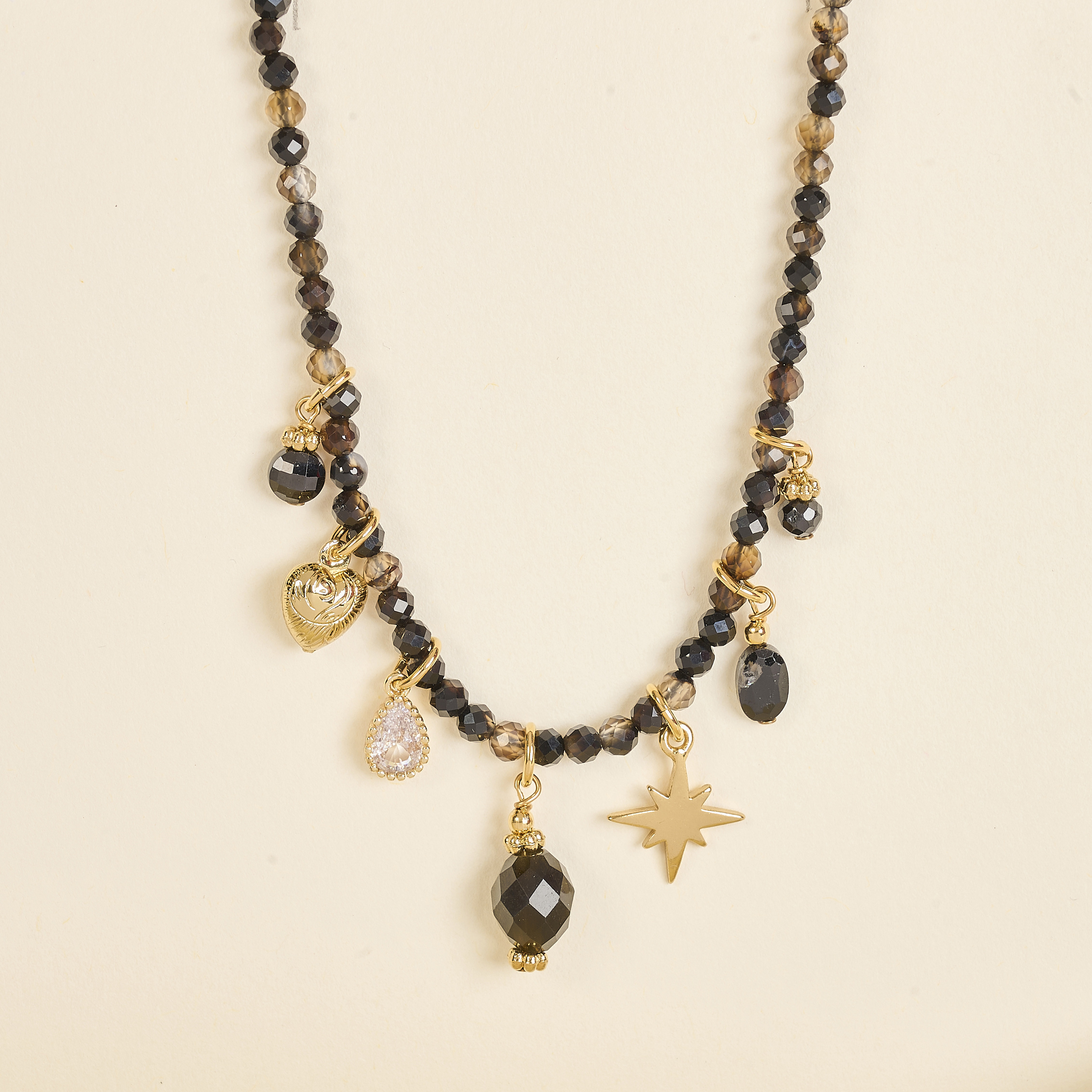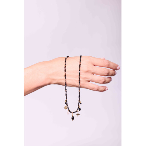 Raffiné et lumineux, ce collier de 38 cm de longueur associe de fines perles facettées d’agate noire et brune de 3 mm à une composition de charmes dorés : étoile, cœur, goutte, perles et éclats de cristal.