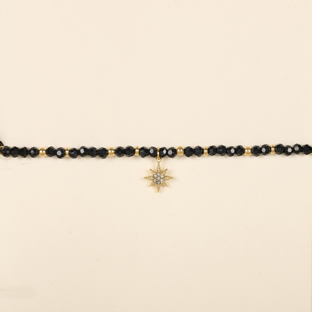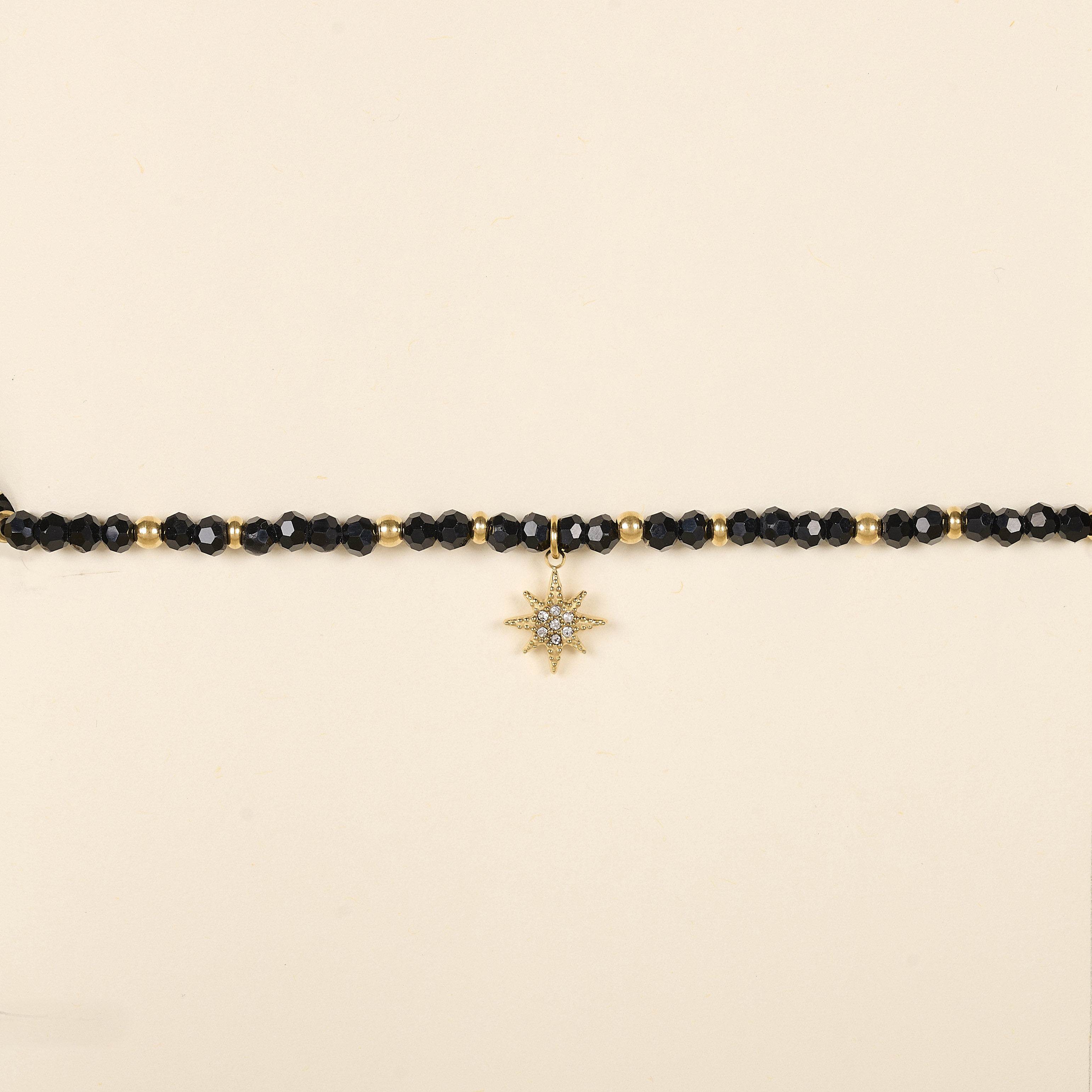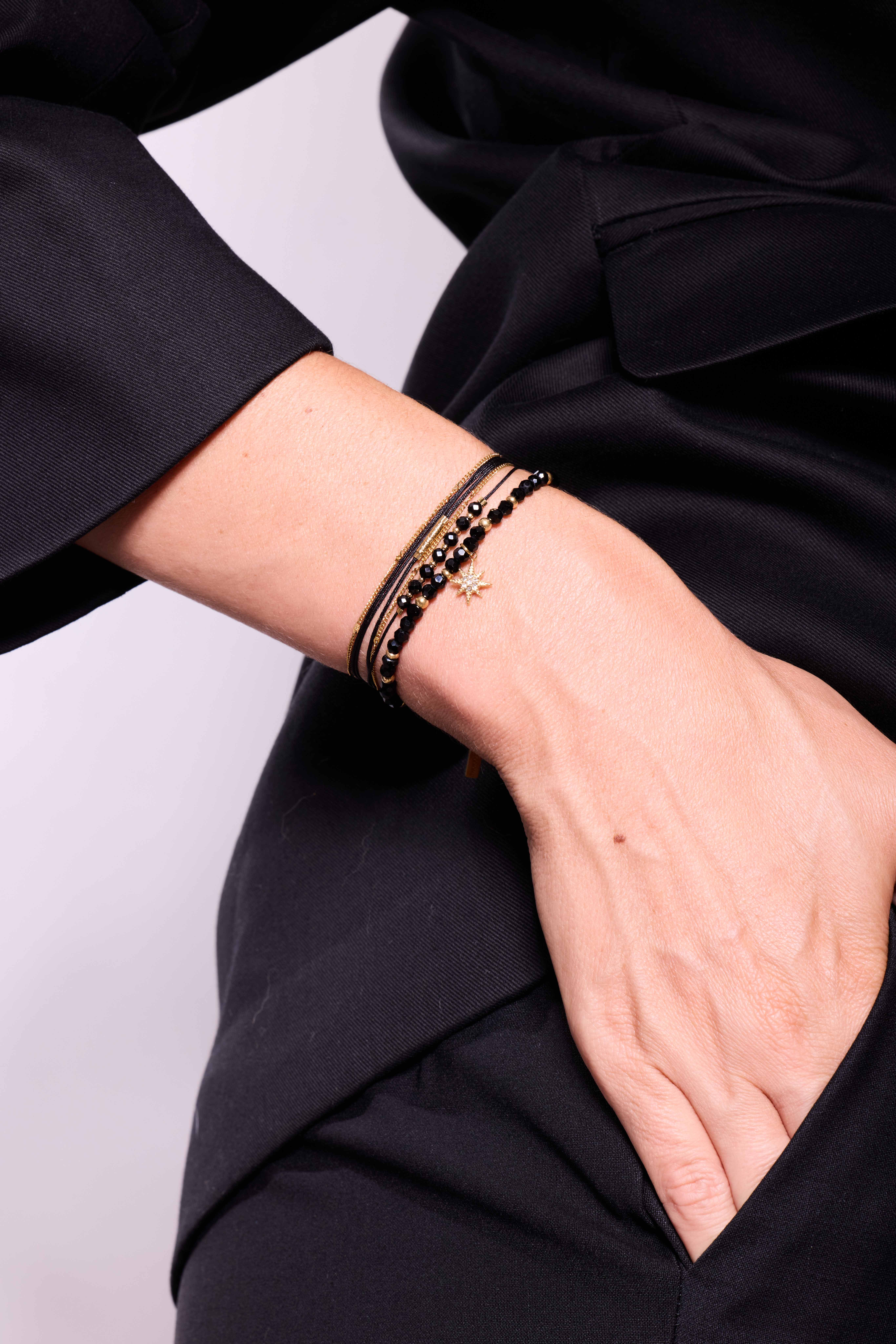 Le bracelet Nino associe des perles d'onyx à une série de charmes dorés : cœur, étoile, trèfle et goutte facettée.