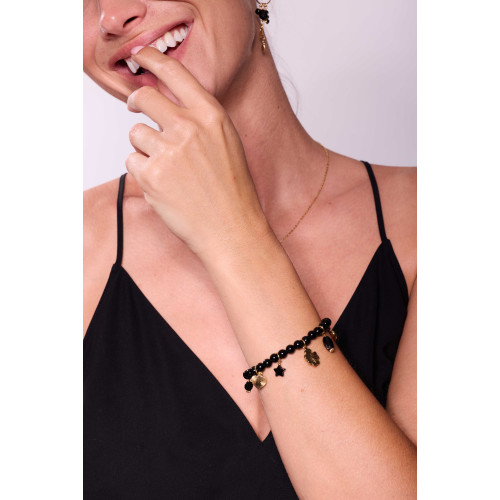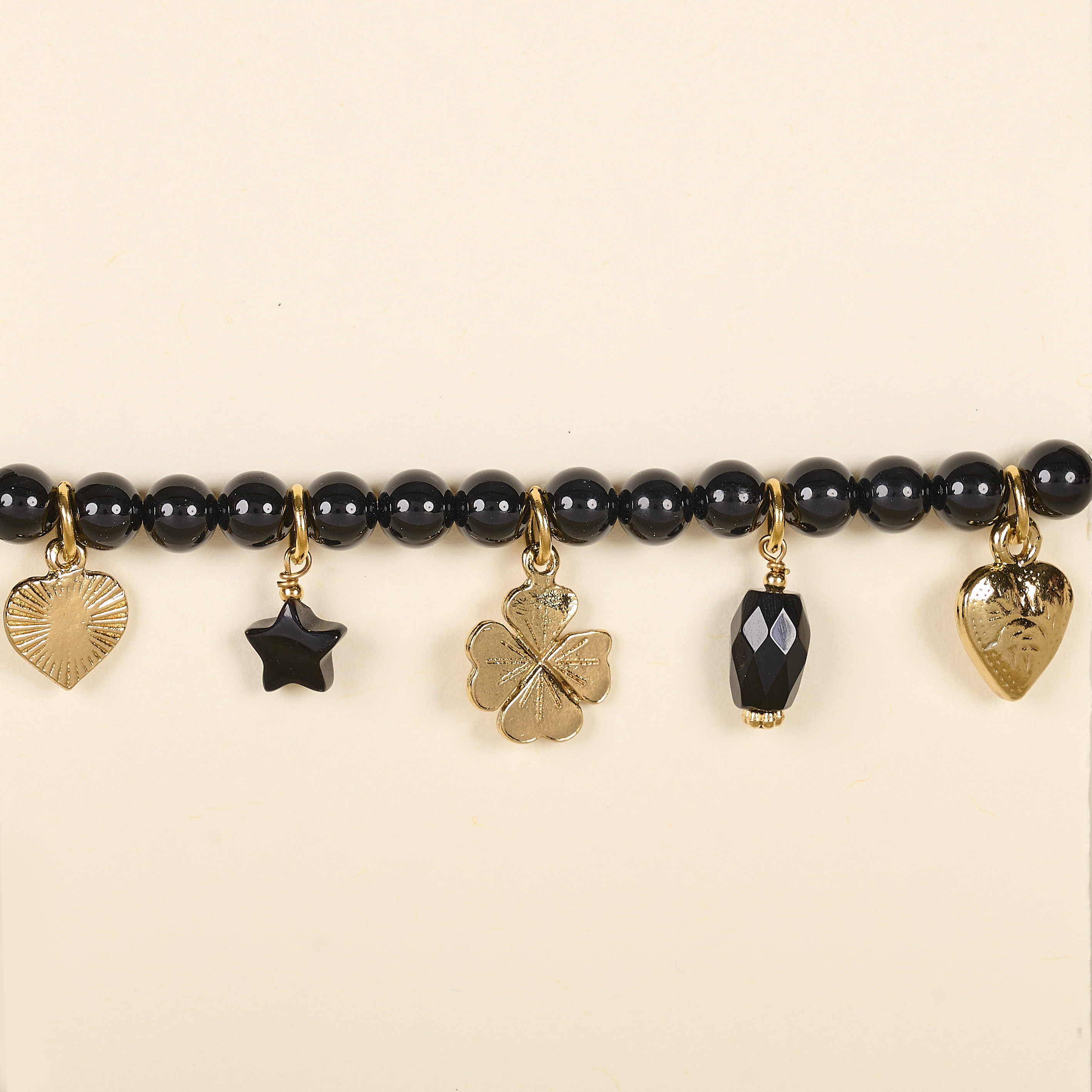 Le bracelet Nino associe des perles d'onyx à une série de charmes dorés : cœur, étoile, trèfle et goutte facettée.