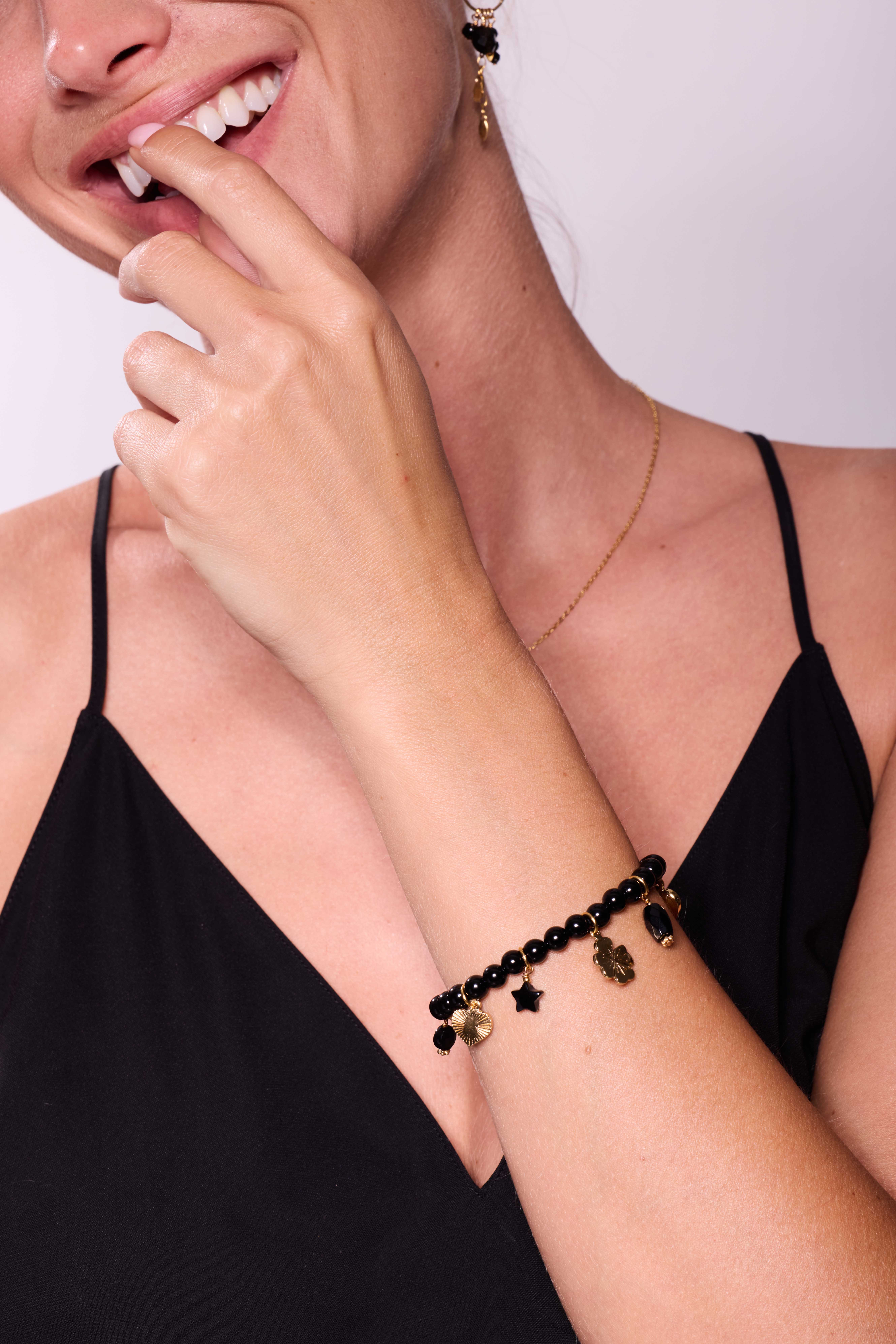 Le bracelet Nino associe des perles d'onyx à une série de charmes dorés : cœur, étoile, trèfle et goutte facettée.