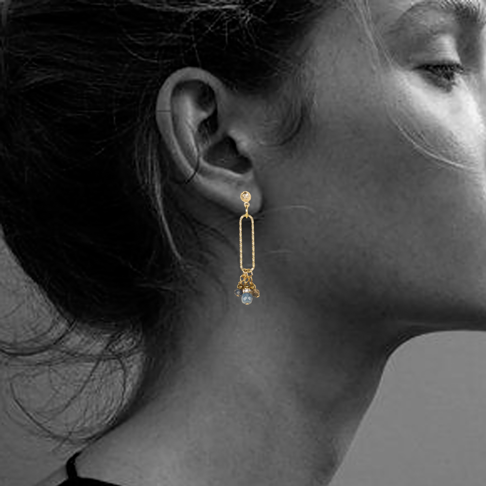 Les boucles d'oreilles Cris grises allient lapis lazuli et anneau ovale délicatement ciselé. Légères et mobiles, elles apportent une touche délicate et féminine.