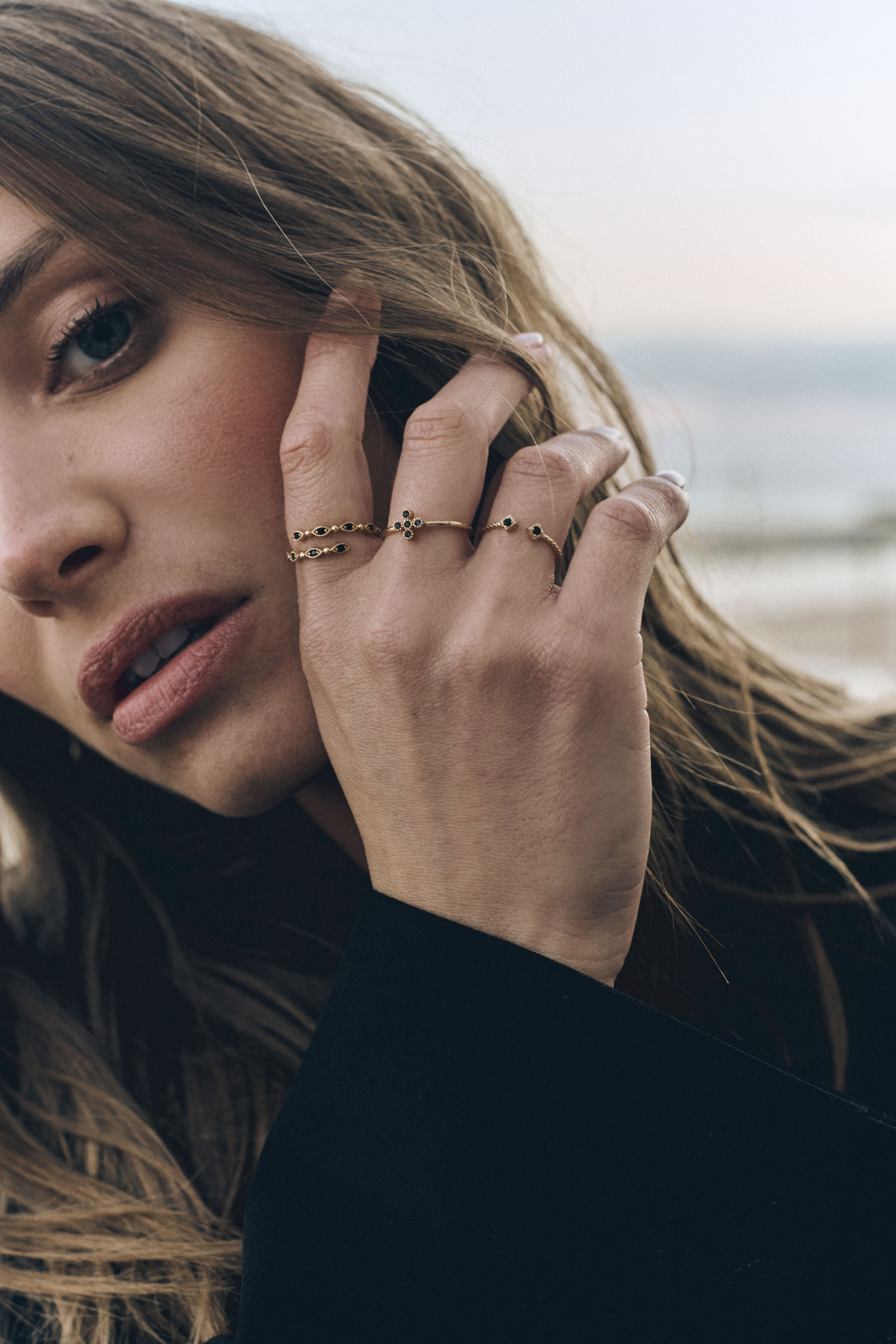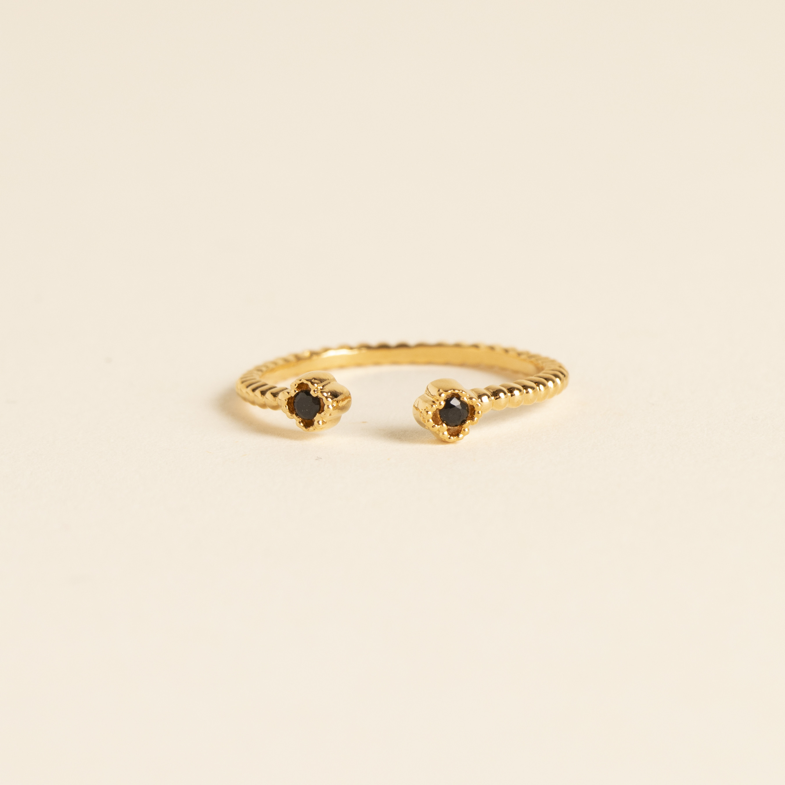 Sublimez votre main avec cette bague ajustable, ornée de cristaux noirs étincelants et délicatement dorée à l'or fin 24 carats.