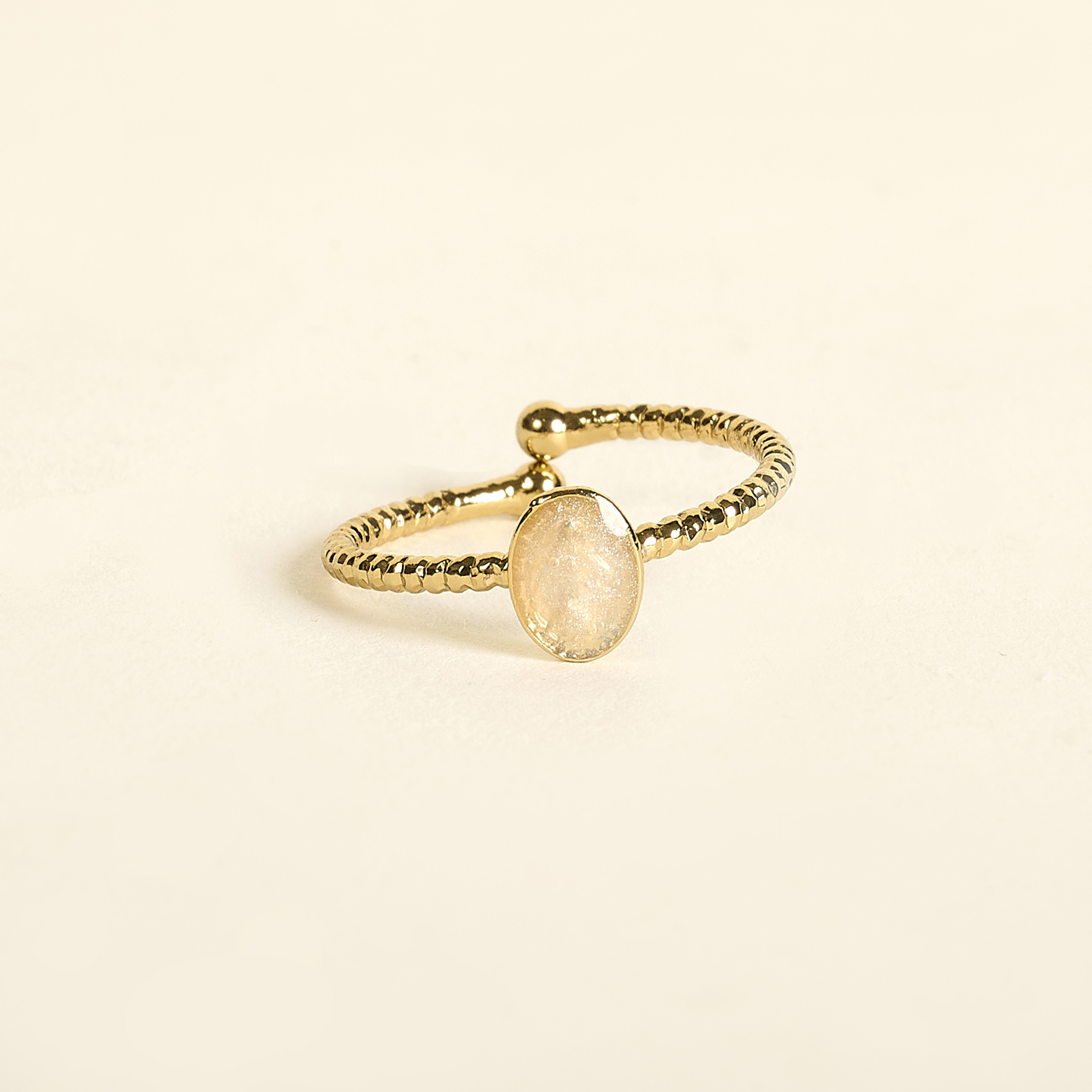 La bague Lyra Nacre By Garance charme par son éclat subtil : un médaillon émaillé aux reflets doux et irisés, mis en valeur par une monture dorée finement texturée. Chaque mouvement révèle de nouvelles nuances, offrant une allure délicate et intemporelle.