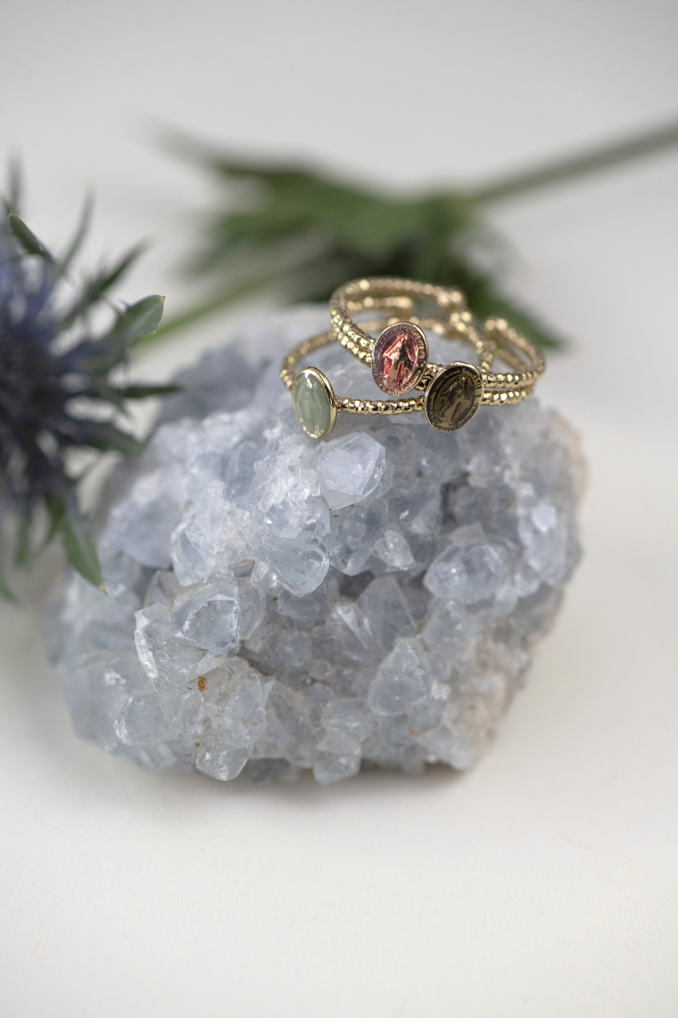 La bague Lyra Céladon By Garance dévoile un médaillon émaillé délicatement taillé dans une nuance vert tendre, symbole d’équilibre et de douceur. Sa monture dorée à l’or fin, ornée de petites billes martelées, enveloppe la pierre comme un écrin lumineux et précieux.