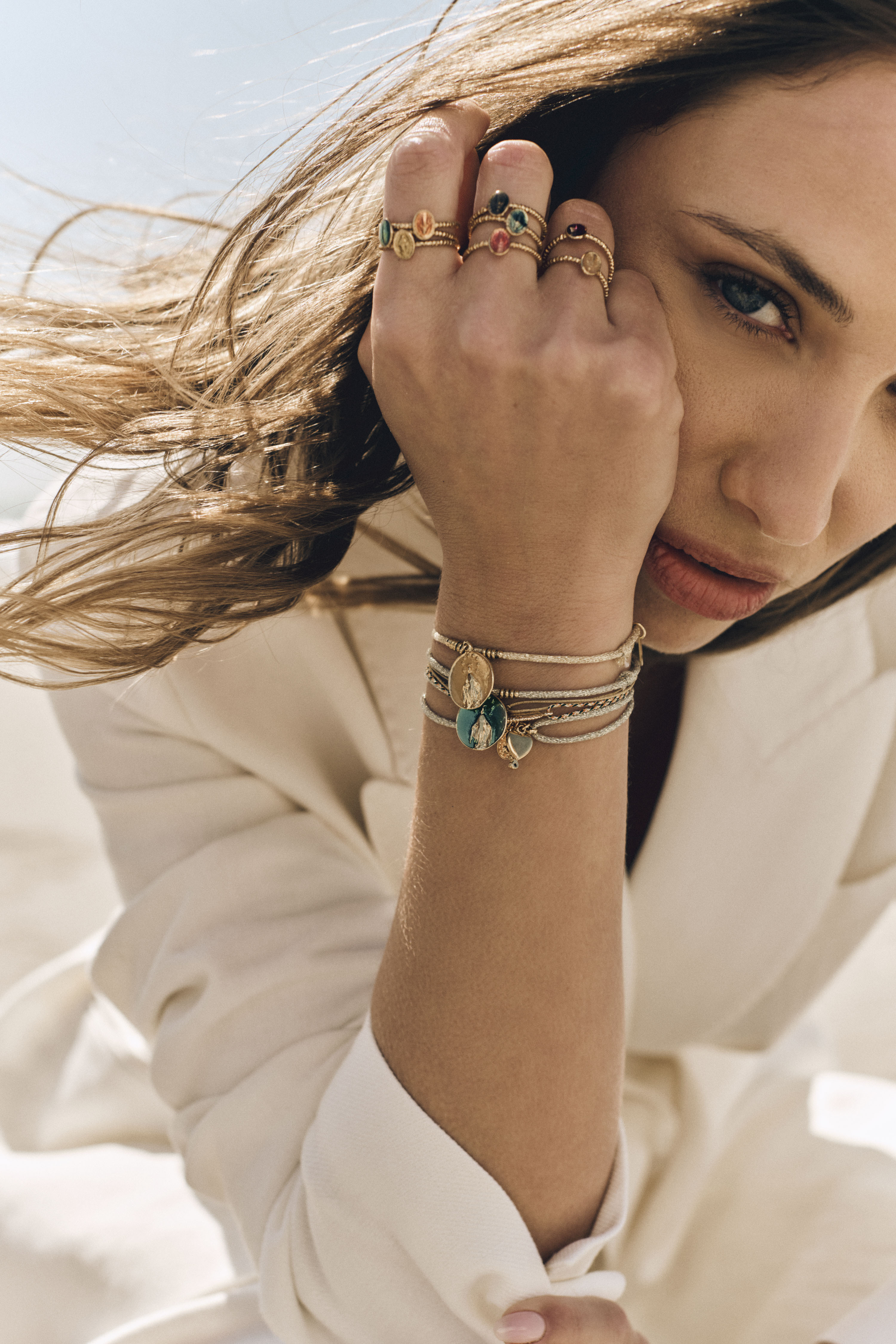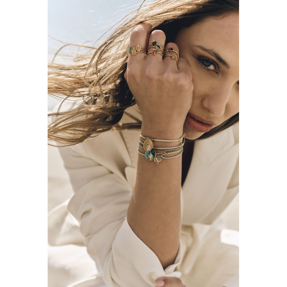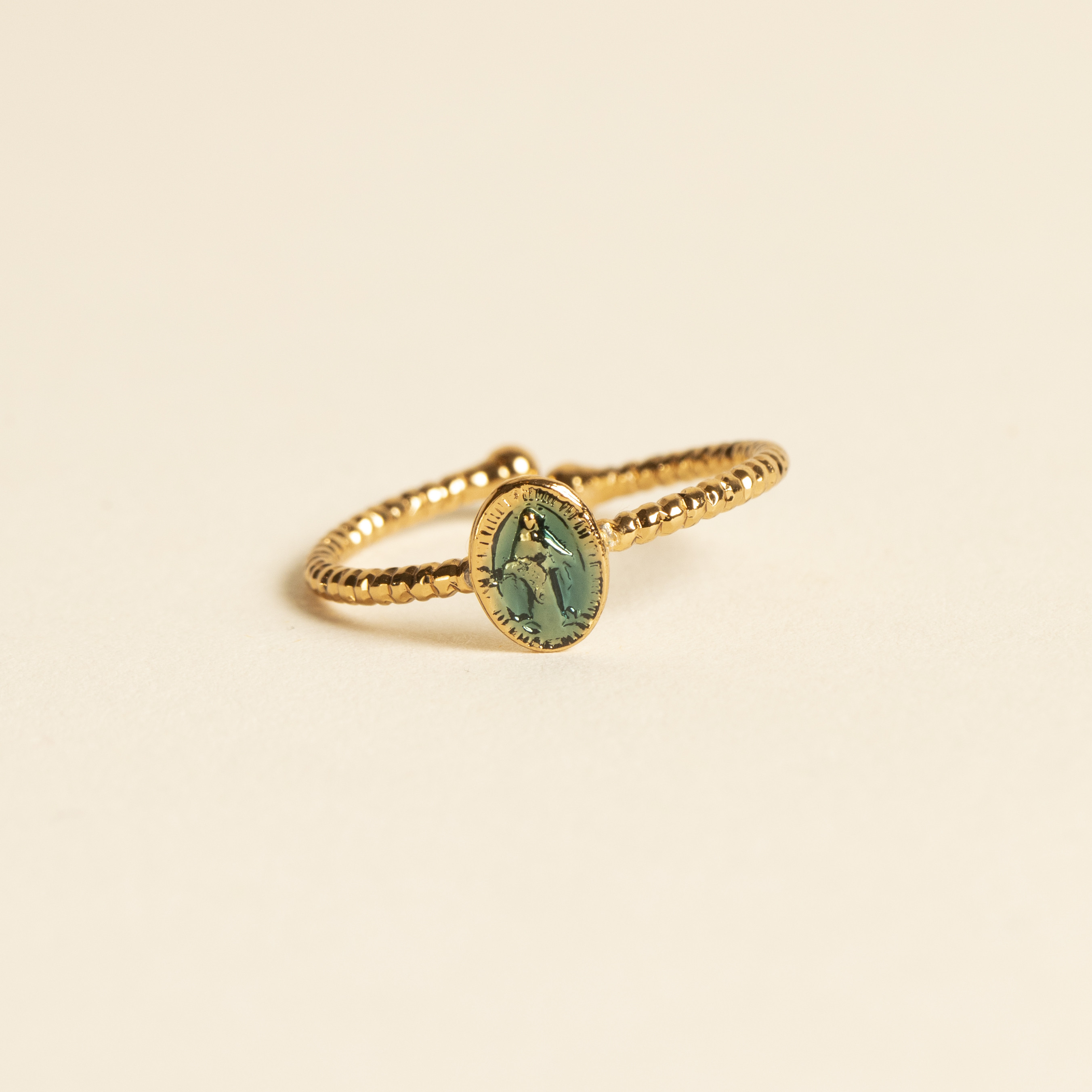 Les bagues Ivor se composent d'une médaille Vierge Miraculeuse émaillée à la main sur un anneau ajustable torsadé et se déclinent en 8 coloris d'émail.