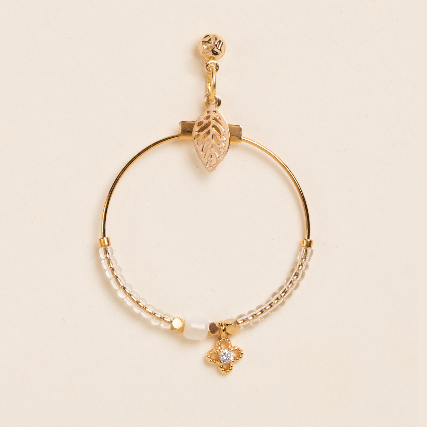 Les boucles d'oreilles Diva trèfle, allient les perles miyuki, les perles en nacre sur un anneau de 3 cm de diamètre et un pendentif serti d'oxyde de zirconium. La fermeture est une tige avec une petite poussette comme fermeture arrière. Les perles miyuki sont de couleur cristal.