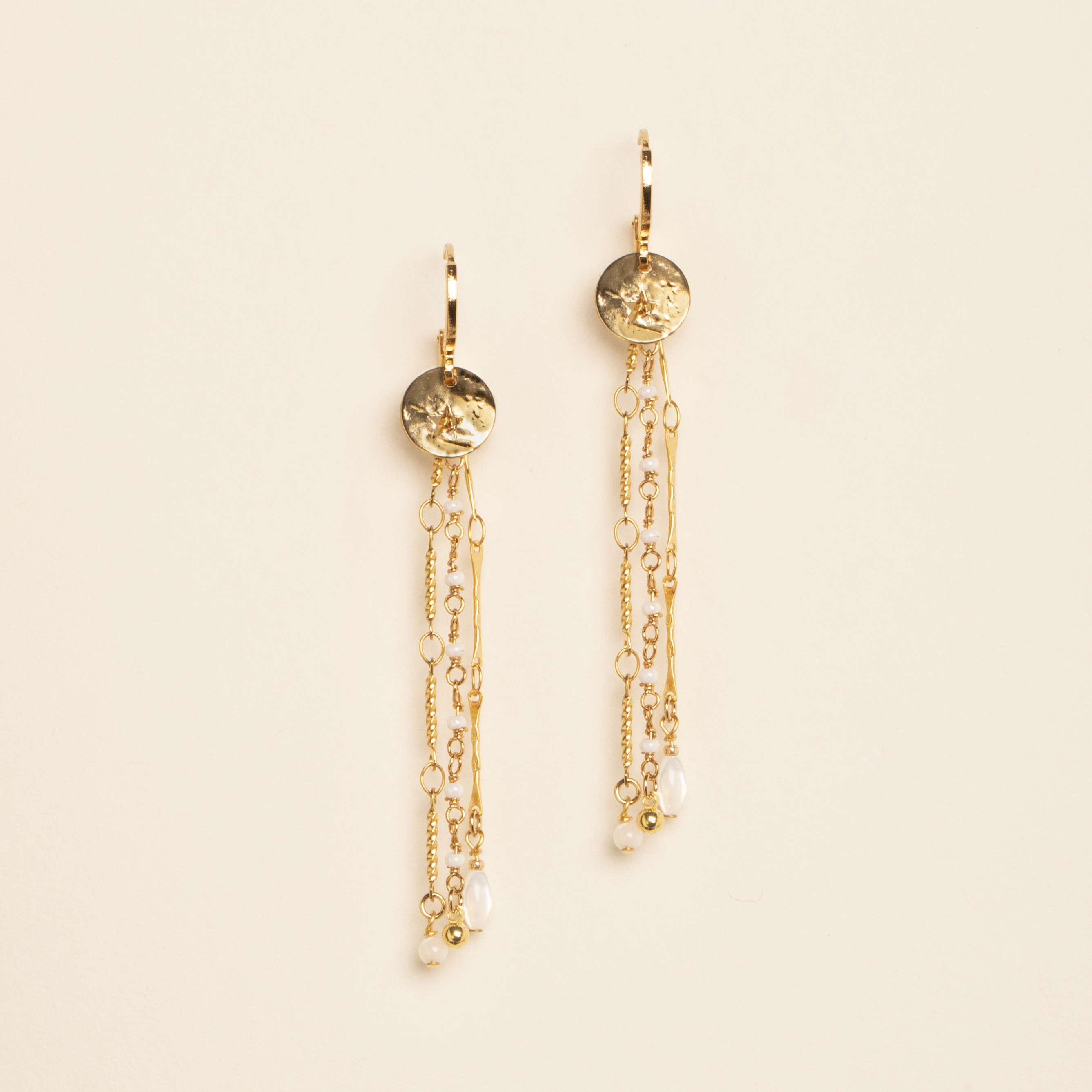 Les boucles Dési sont constituées de trois chaines fines de Rosaire qui tombent délicatement. Elles se terminent par des perles en nacre blanche.