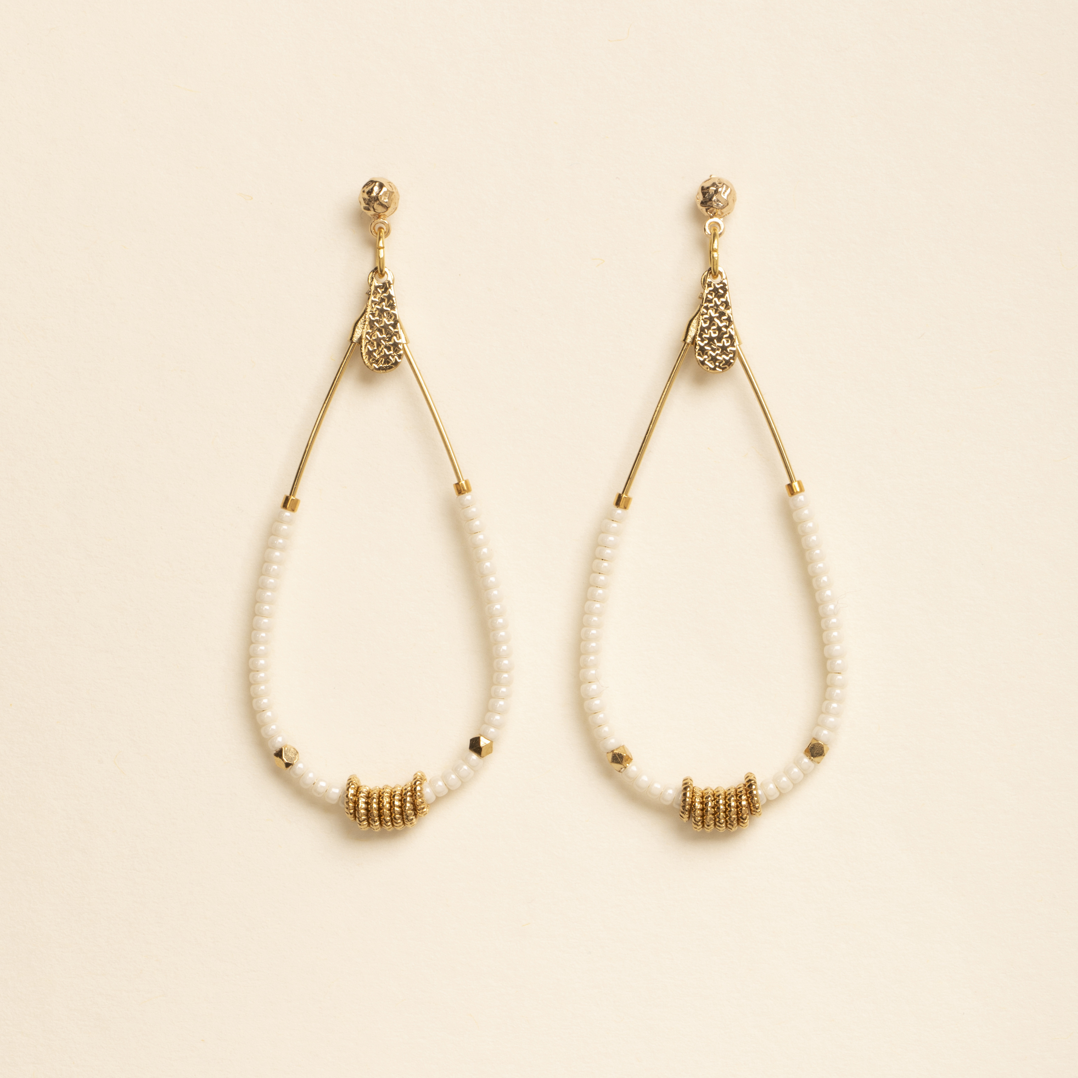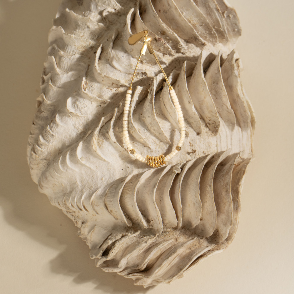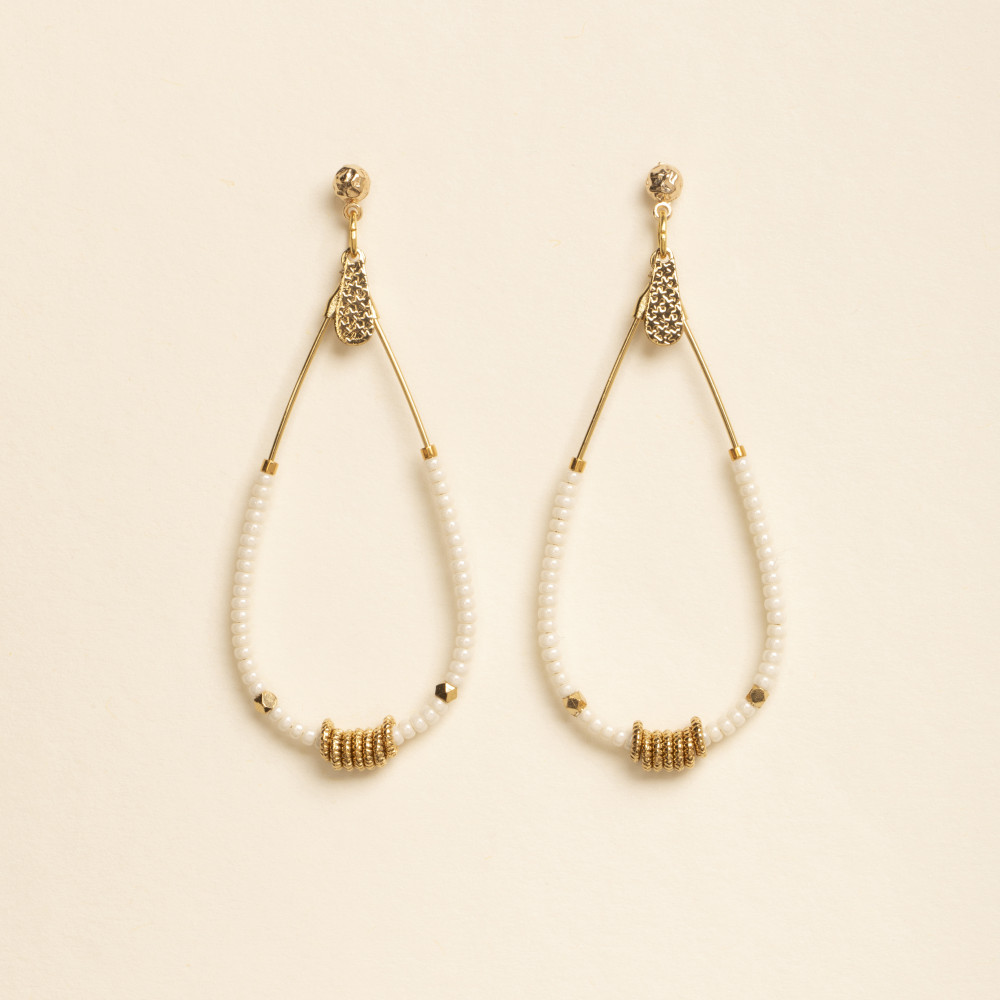 Les boucles d'oreilles Edda blanche, allient les perles miyuki, les perles dorées sur un anneau en forme de goutte de 5cm de longueur. La fermeture est une tige avec une petite poussette comme fermeture arrière. Les perles miyuki sont de couleur blanc cassé.