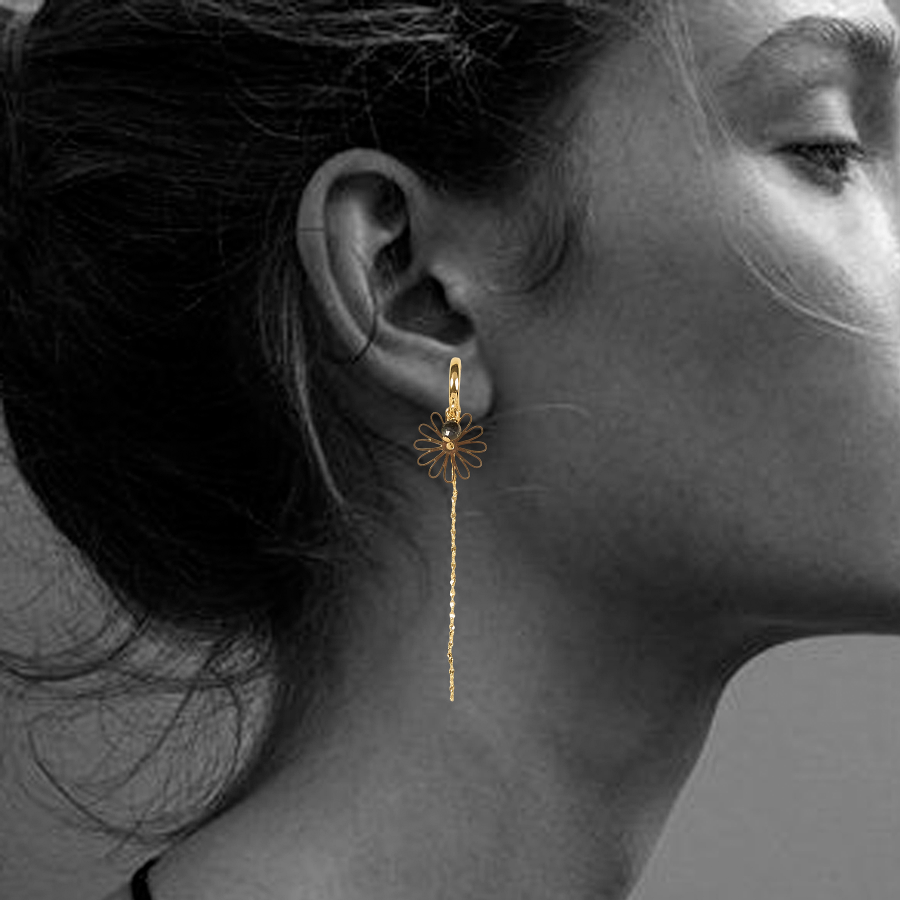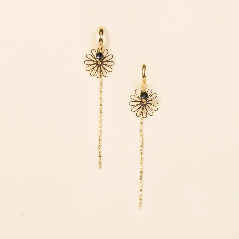 Les boucles d’oreilles Adra allient finesse et originalité dans un design délicatement travaillé. Elles associent tourmaline verte foncée à une chaîne élégante et un pendentif ajouré en forme de fleur, créant un bijou à la fois raffiné et plein de charme.