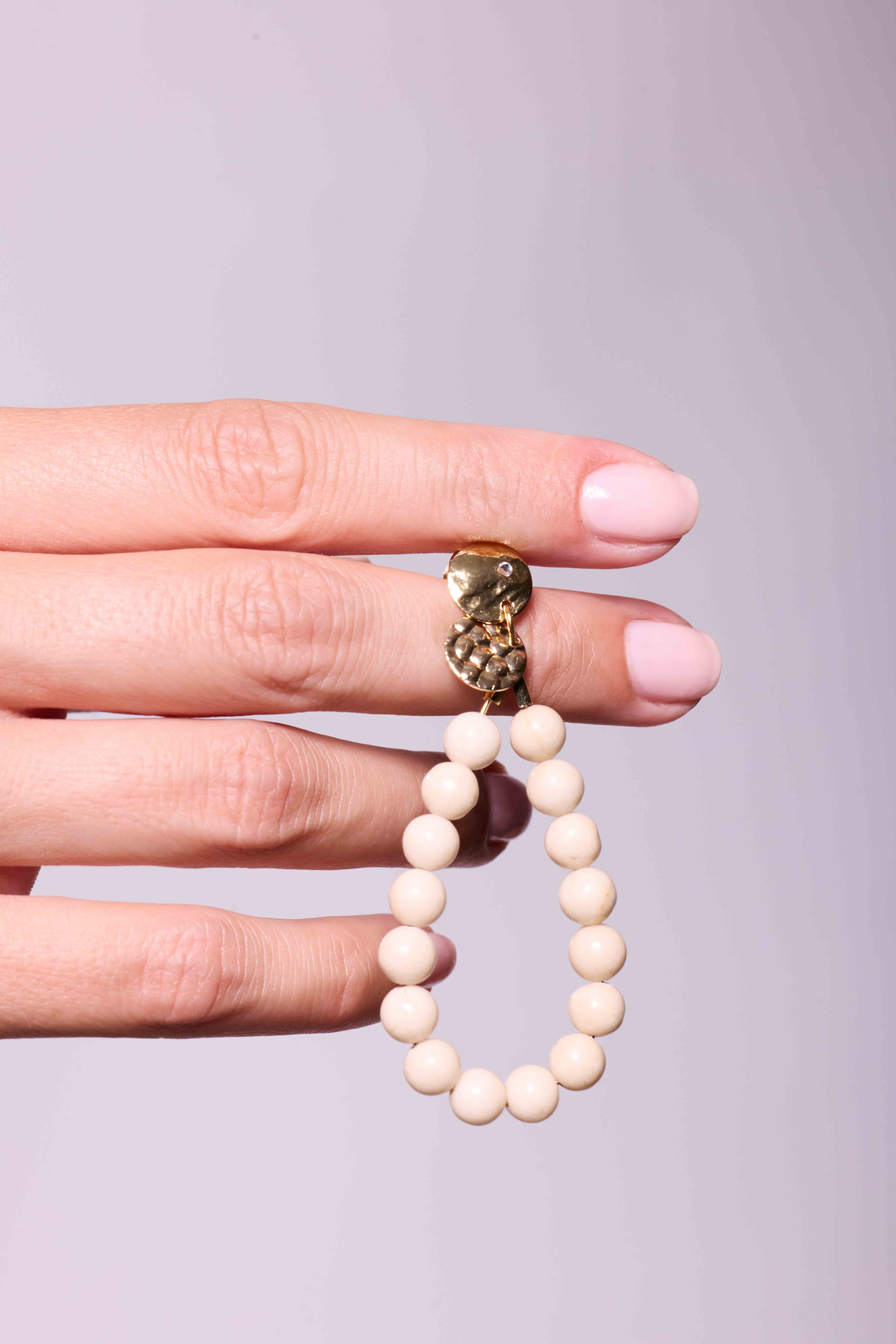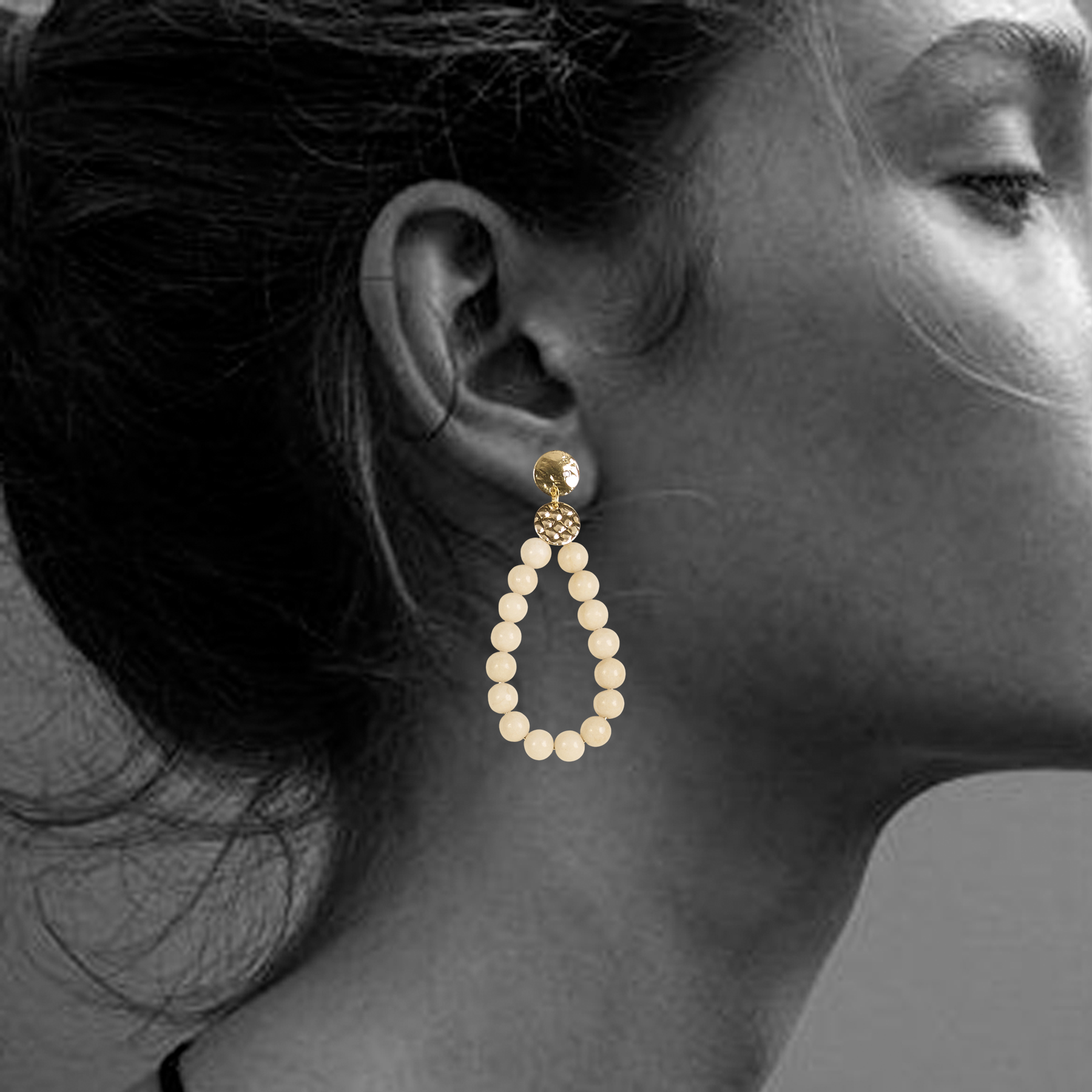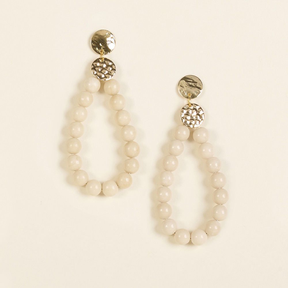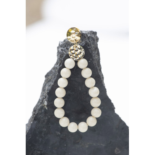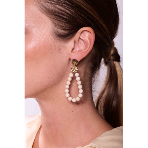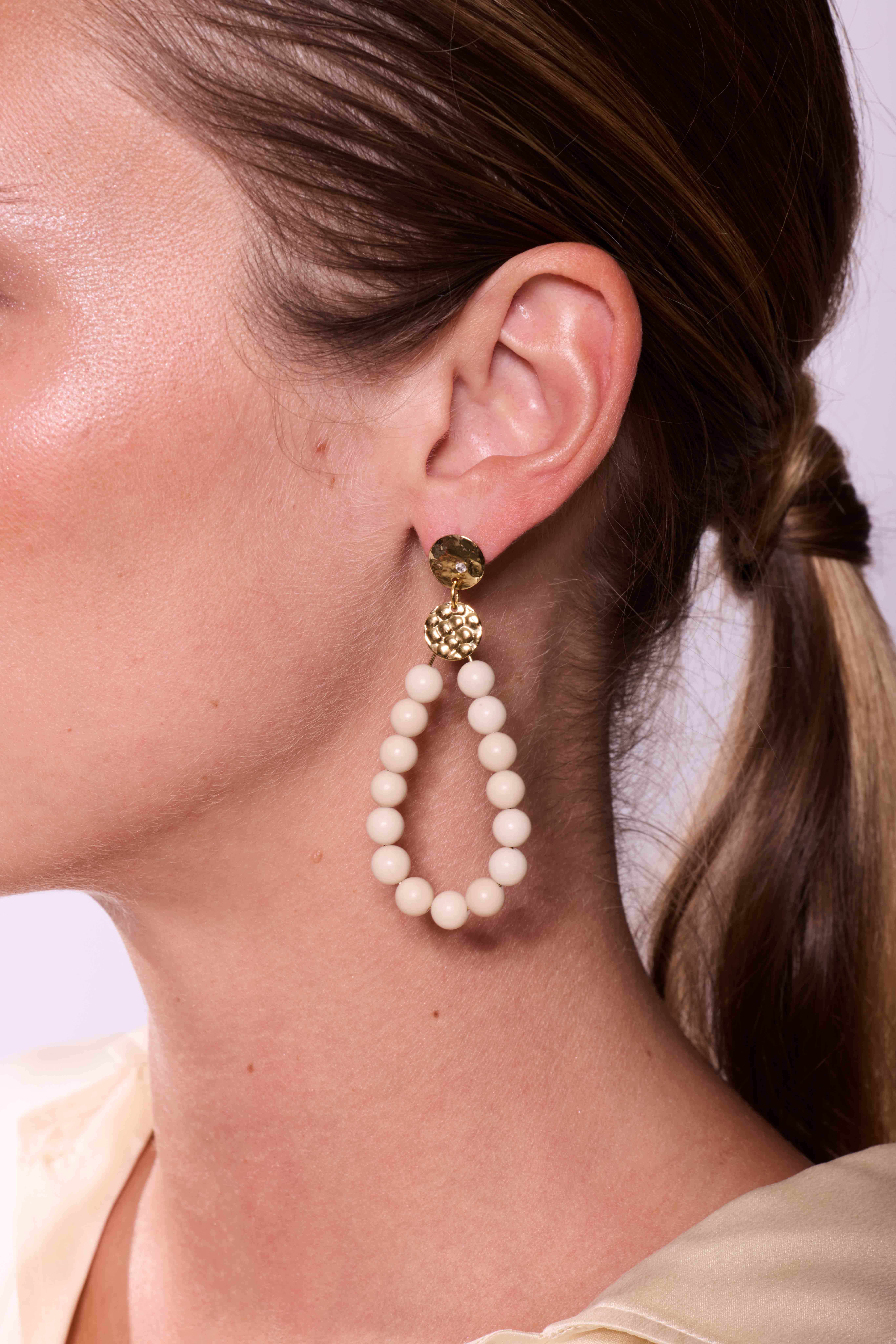 Les boucles d’oreilles Axel, pièces au charme solaire, incarnent à la fois l’esprit raffiné et audacieux de notre maison. Elles associent avec élégance la pierre de rivière délicatement montée sur un anneau en forme de goutte de 5 cm de hauteur à de fines médailles martelées.