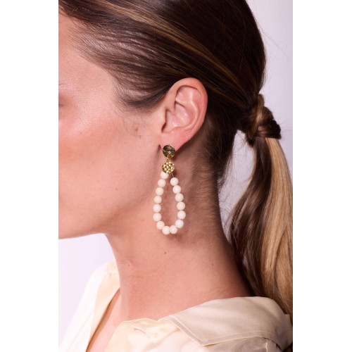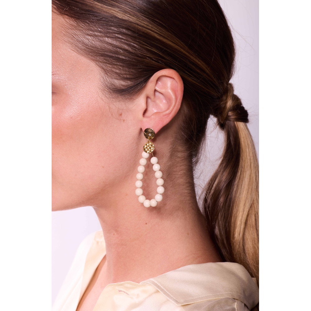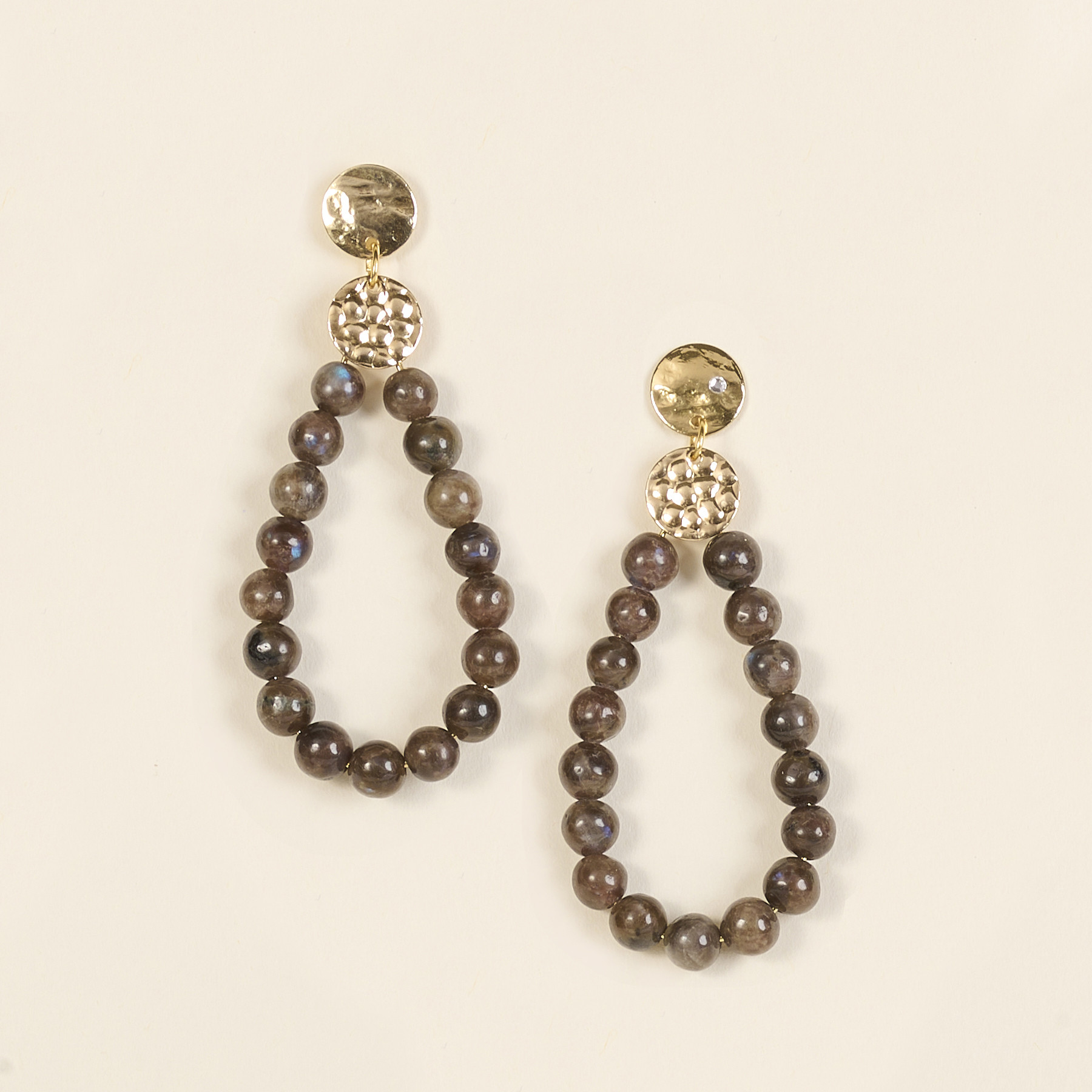 Les boucles d’oreilles Axel, pièces au charme solaire, incarnent à la fois l’esprit raffiné et audacieux de notre maison. Elles associent avec élégance feldspath taupe délicatement montée sur un anneau en forme de goutte de 5 cm de hauteur à de fines médailles martelées.