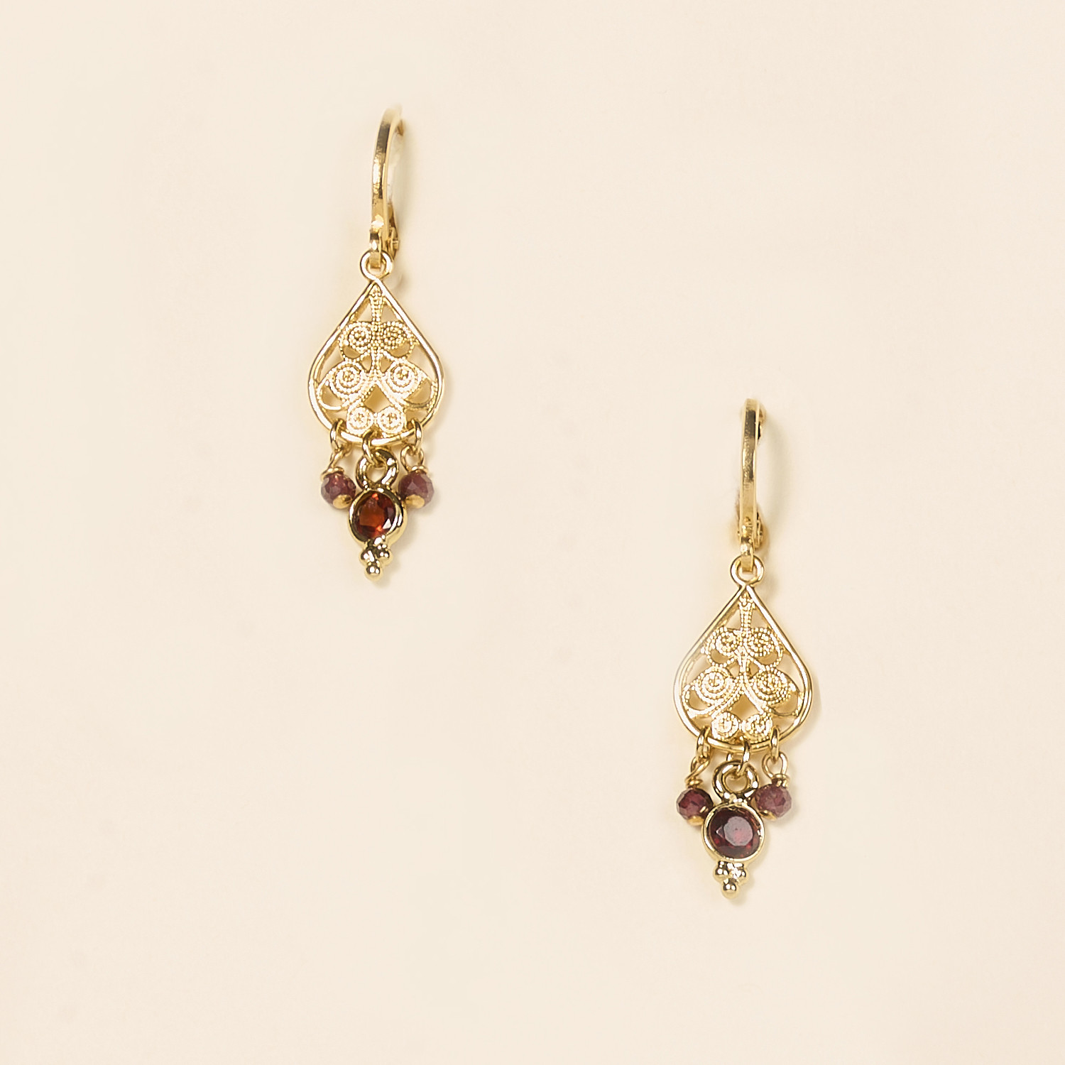 Les boucles d’oreilles Azia allient élégance et raffinement à travers un subtil mariage de pierres fines rondes serties clos telle que le grenat et d’un délicat motif en forme de goutte en filigrane. Chaque détail est pensé pour créer un équilibre parfait entre brillance et légèreté.