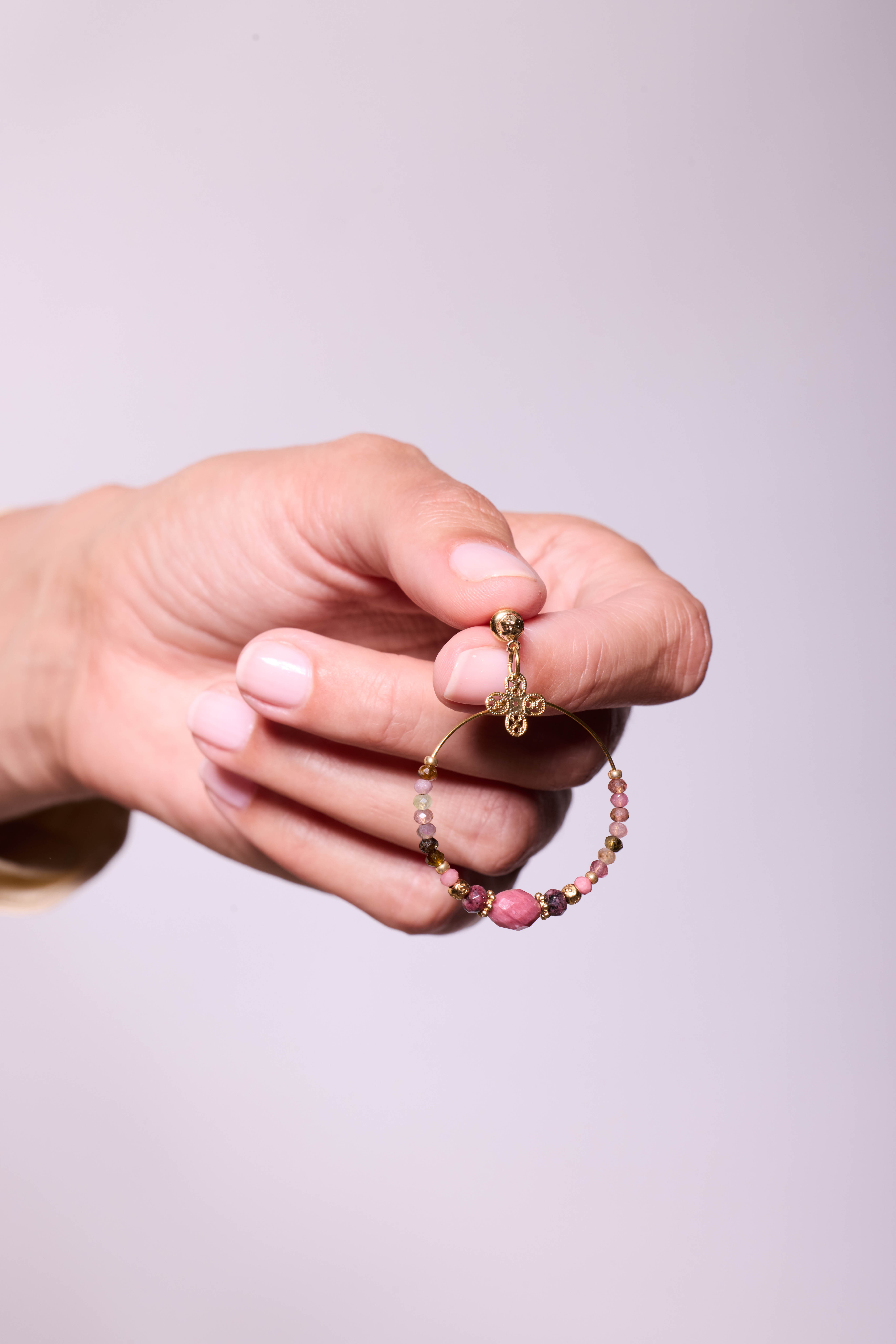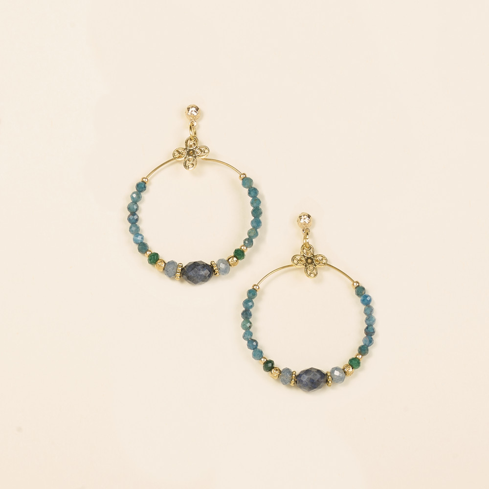 Les boucles d’oreilles Bell allient élégamment pierres fines et perles dorées aux formes variées, délicatement montées sur un anneau rond de 3 cm de diamètre.