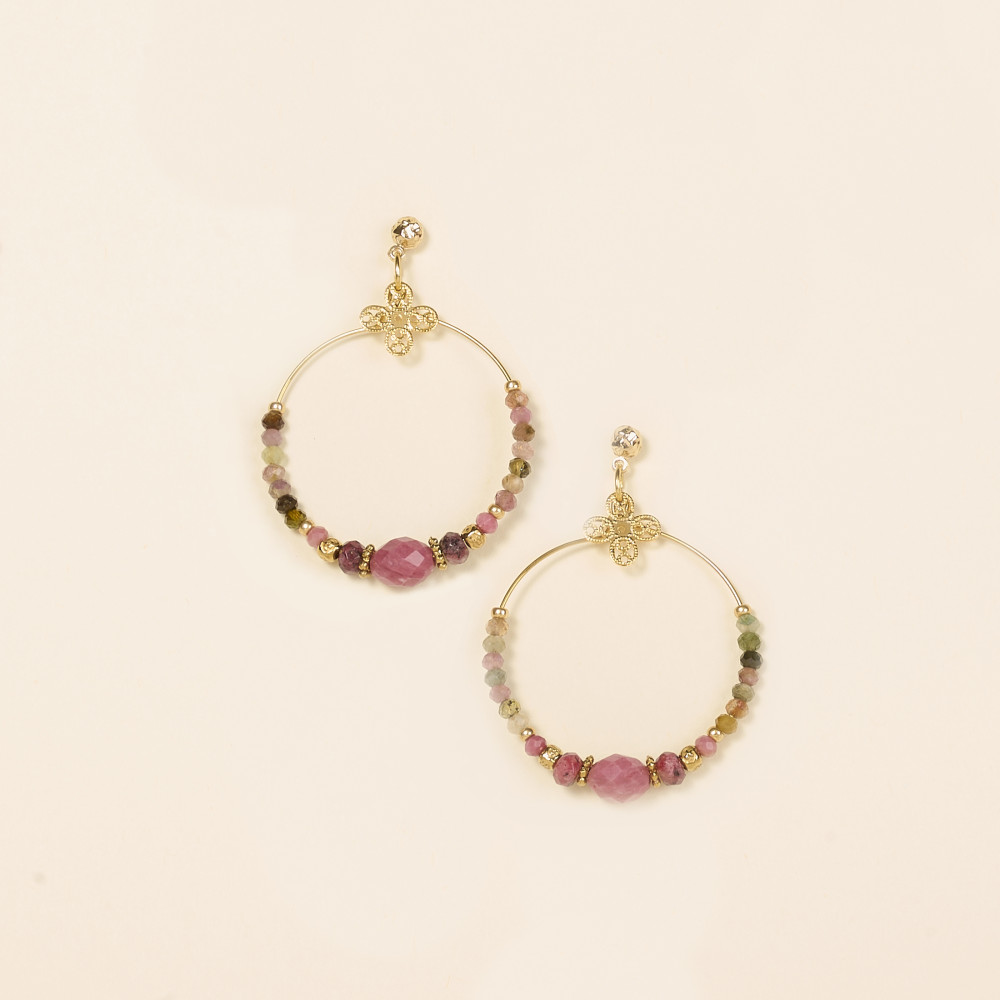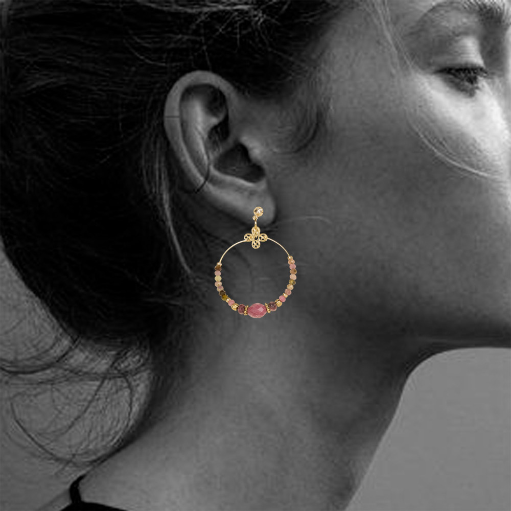 Les boucles d’oreilles Bell allient élégamment pierres fines et perles dorées aux formes variées, délicatement montées sur un anneau rond de 3 cm de diamètre.