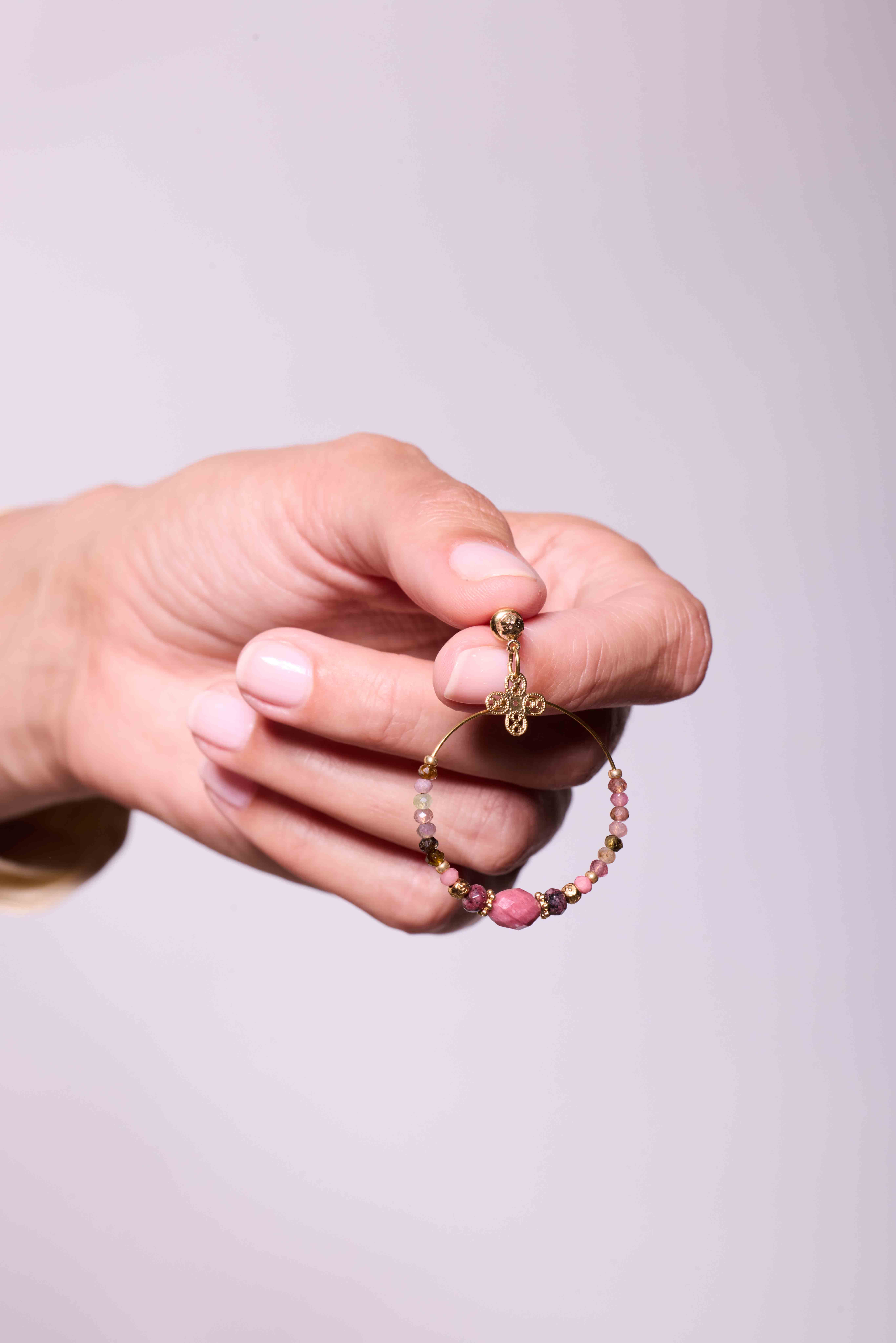 La perle centrale, une rhodonite ovale et facettée, apporte une touche raffinée et lumineuse à cette création, tandis qu’une petite médaille en filigrane ajoute un détail subtil et raffiné.