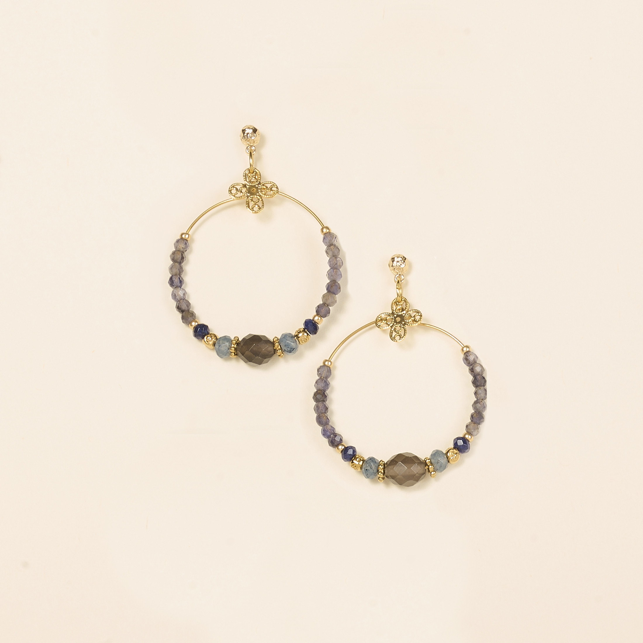 Les boucles d’oreilles Bell allient élégamment pierres fines et perles dorées aux formes variées, délicatement montées sur un anneau rond de 3 cm de diamètre.