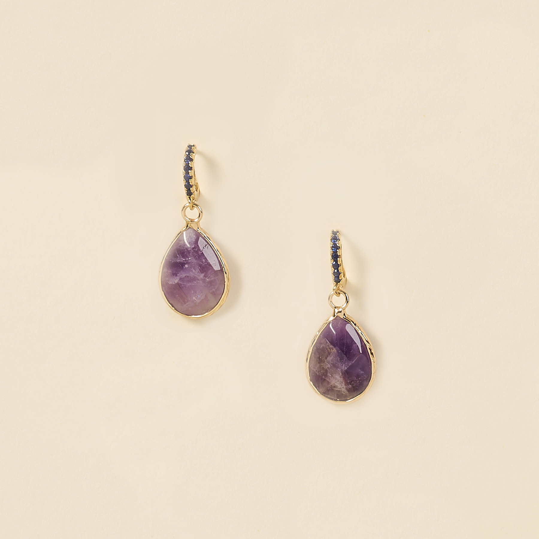 Les boucles d’oreilles Beni séduisent par leur élégance discrète et leur éclat raffiné. Elles mettent en valeur une goutte ovale facettée en améthyste, dont les reflets changeants offrent un jeu de lumière subtil et captivant.