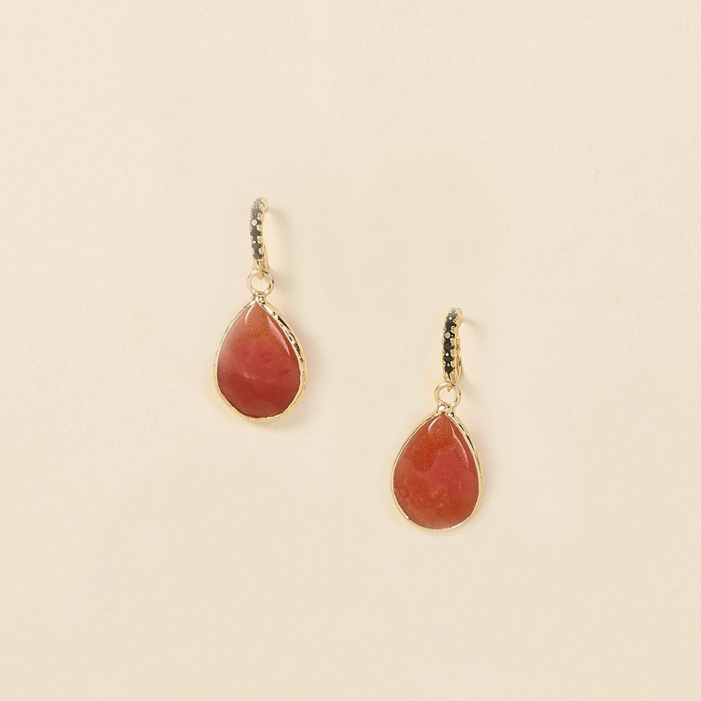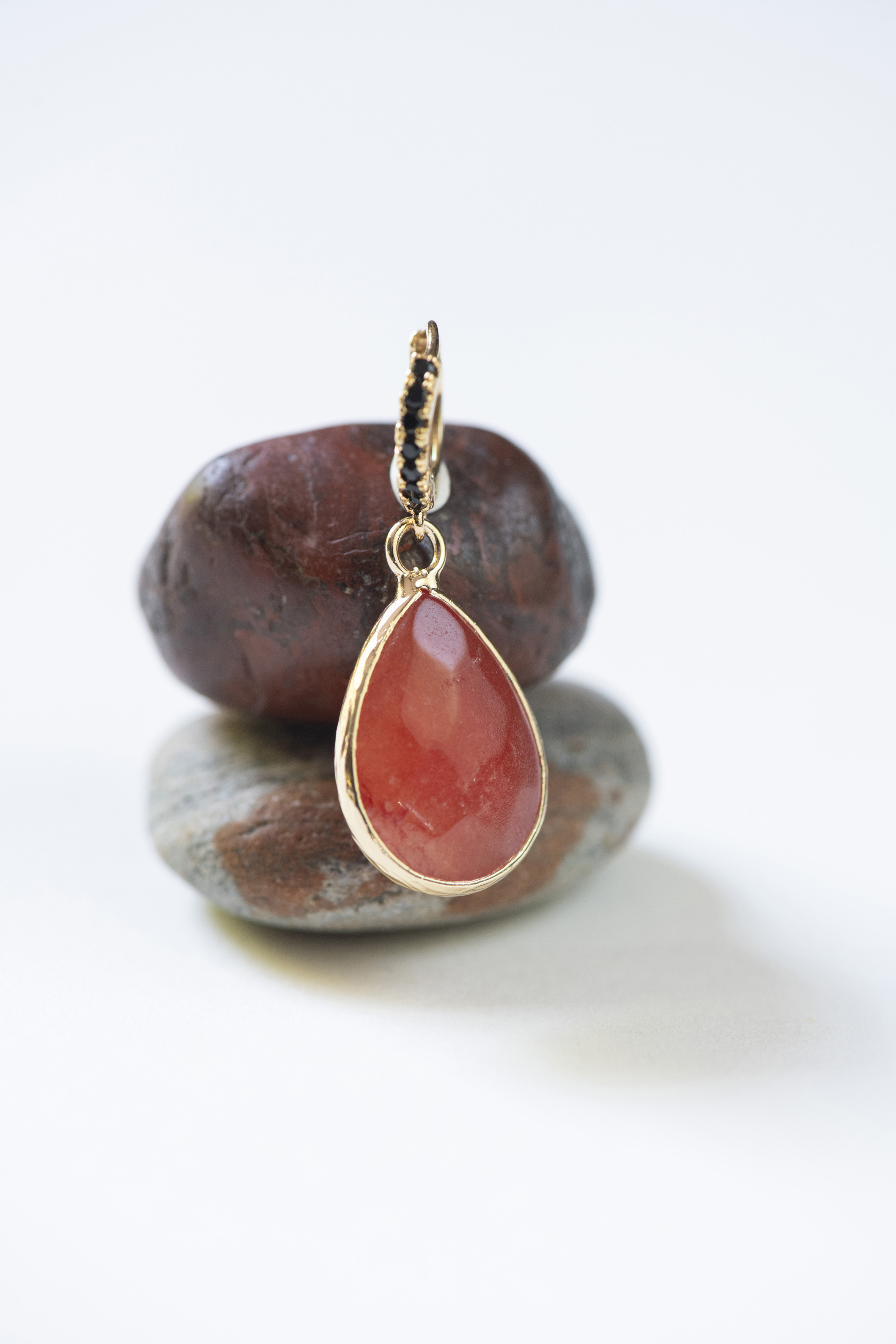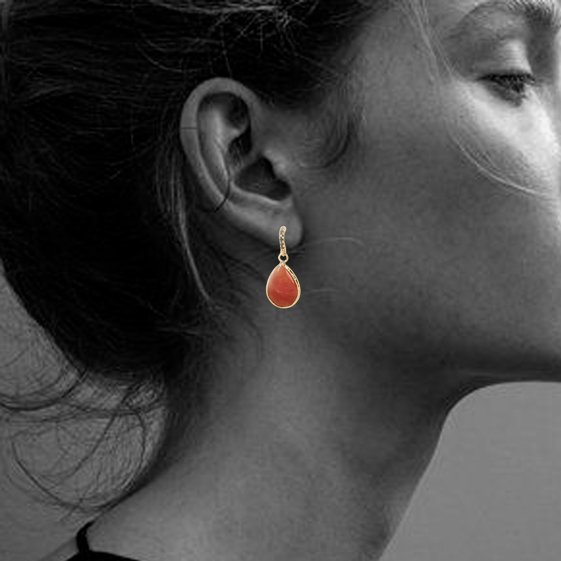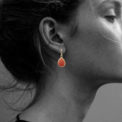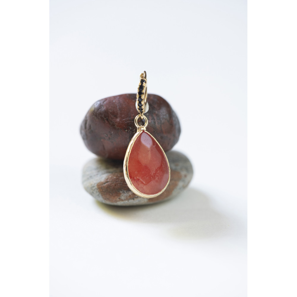 Les boucles d’oreilles Beni séduisent par leur élégance discrète et leur éclat raffiné. Elles mettent en valeur une goutte ovale facettée en agate orange, dont les reflets changeants offrent un jeu de lumière subtil et captivant.