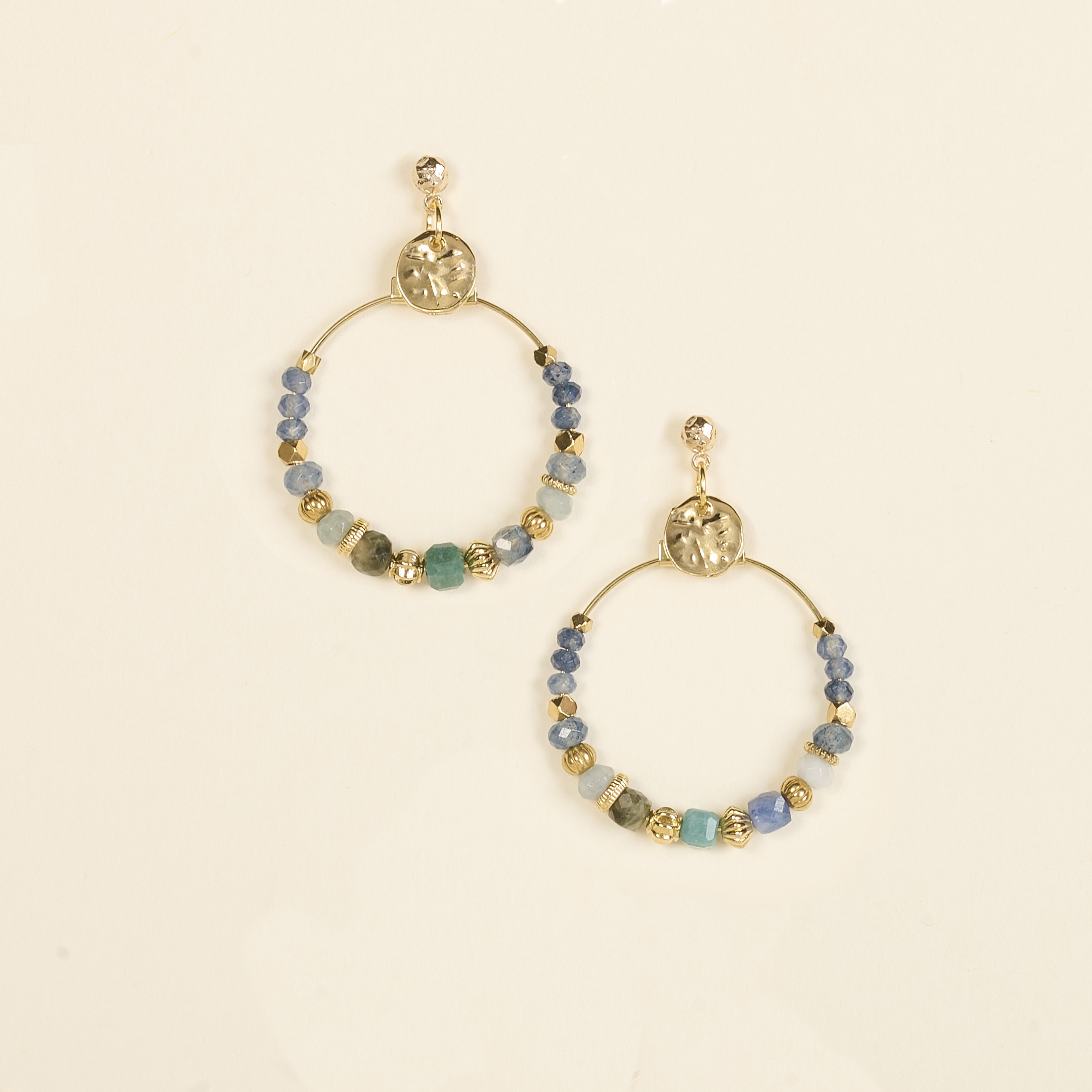 Les boucles d’oreilles Bora, pièce iconique au charme solaire, incarnent l’esprit à la fois raffiné et audacieux de notre maison. Elles associent avec élégance des pierres fines telles que le lapis-lazuli, agate bleue, obsidienne et des perles dorées aux formes variées, délicatement montées sur un anneau rond de 3 cm de diamètre.