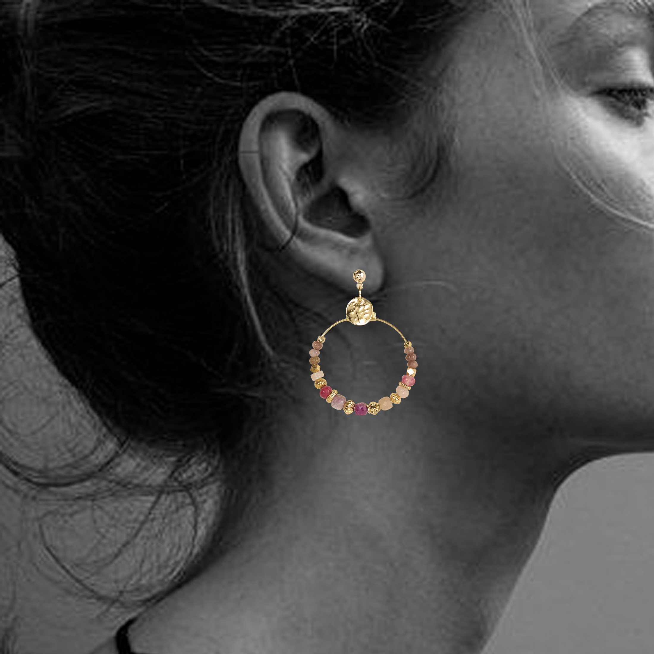 Les boucles d’oreilles Bora, pièce iconique au charme solaire, incarnent l’esprit à la fois raffiné et audacieux de notre maison. Elles associent avec élégance des pierres fines telles que la tourmaline rose, grenat, quartz cherry et des perles dorées aux formes variées, délicatement montées sur un anneau rond de 3 cm de diamètre.