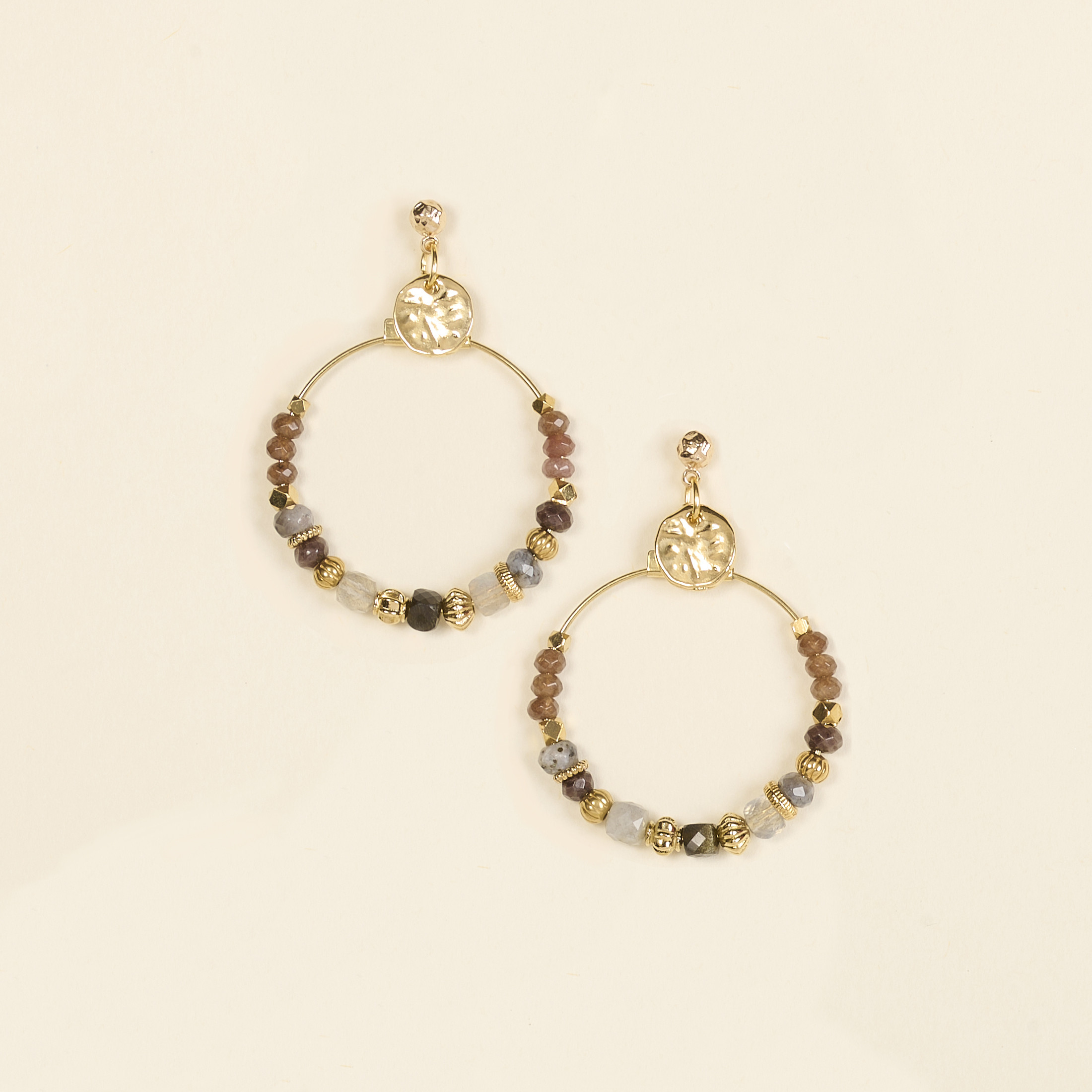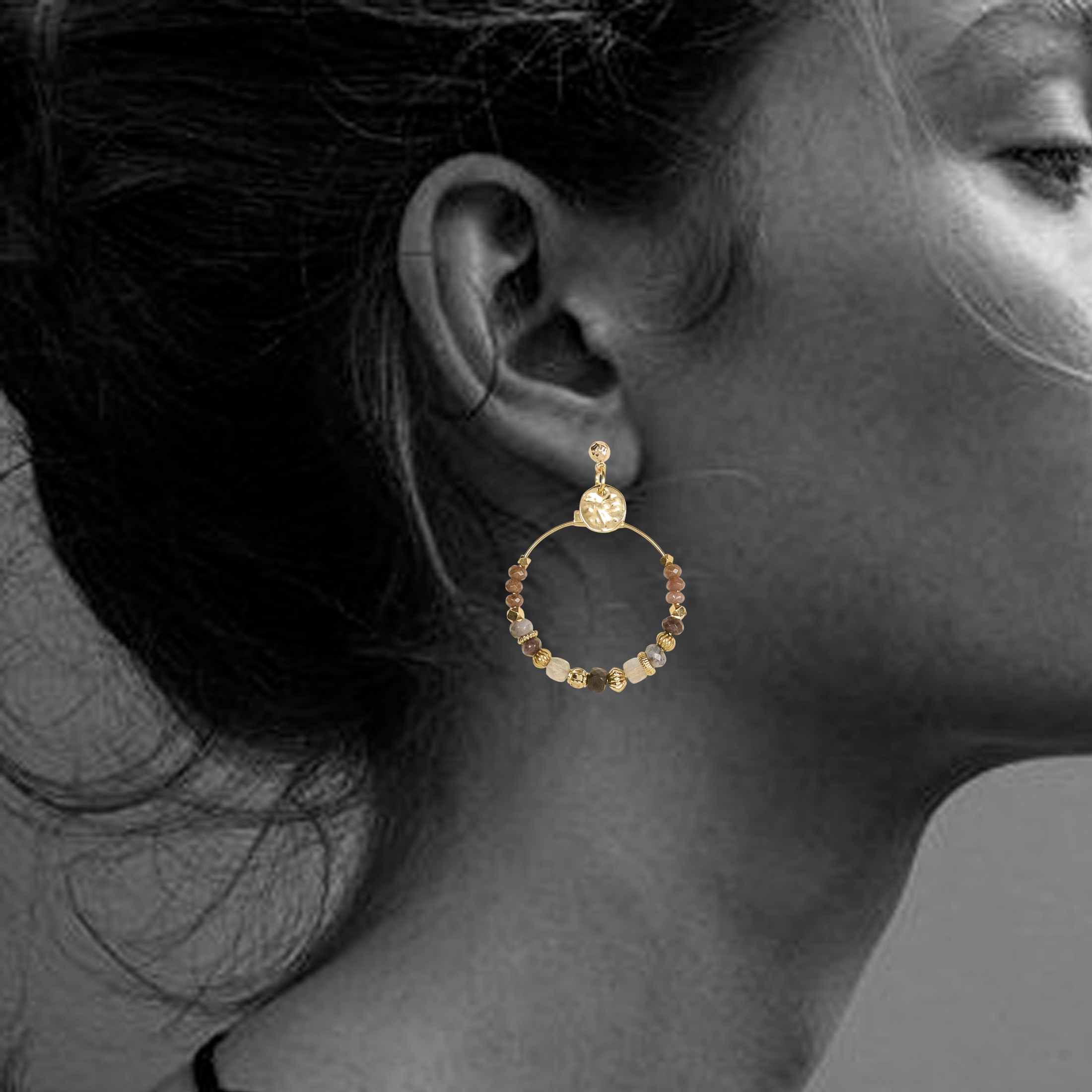 Les boucles d’oreilles Bora, pièce iconique au charme solaire, incarnent l’esprit à la fois raffiné et audacieux de notre maison. Elles associent avec élégance des pierres fines telles que l'obsidienne, labradorite, agate taupe et des perles dorées aux formes variées, délicatement montées sur un anneau rond de 3 cm de diamètre.