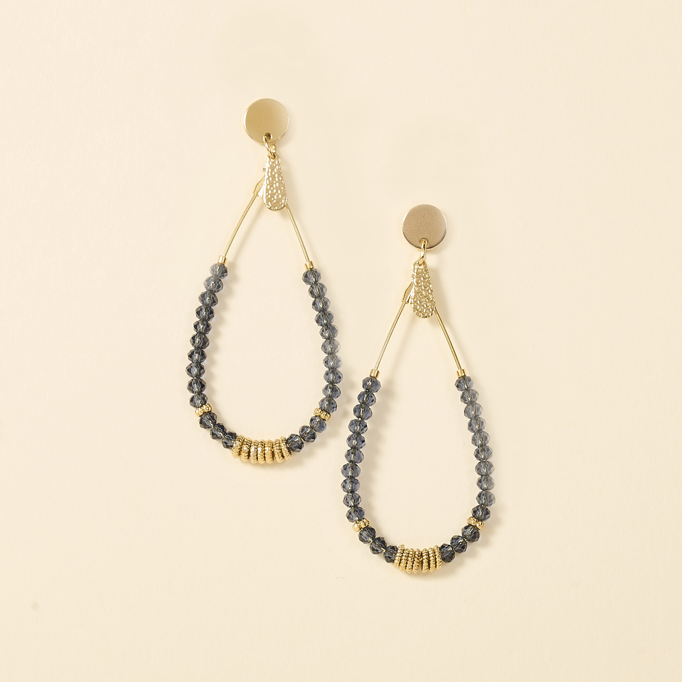 Les boucles d’oreilles Bory séduisent par leur allure élégante et leur éclat raffiné. Dorées à l’or fin, elles se composent d’un anneau en forme de goutte de 5 cm orné de perles en cristal facettées, qui captent la lumière à chaque mouvement.