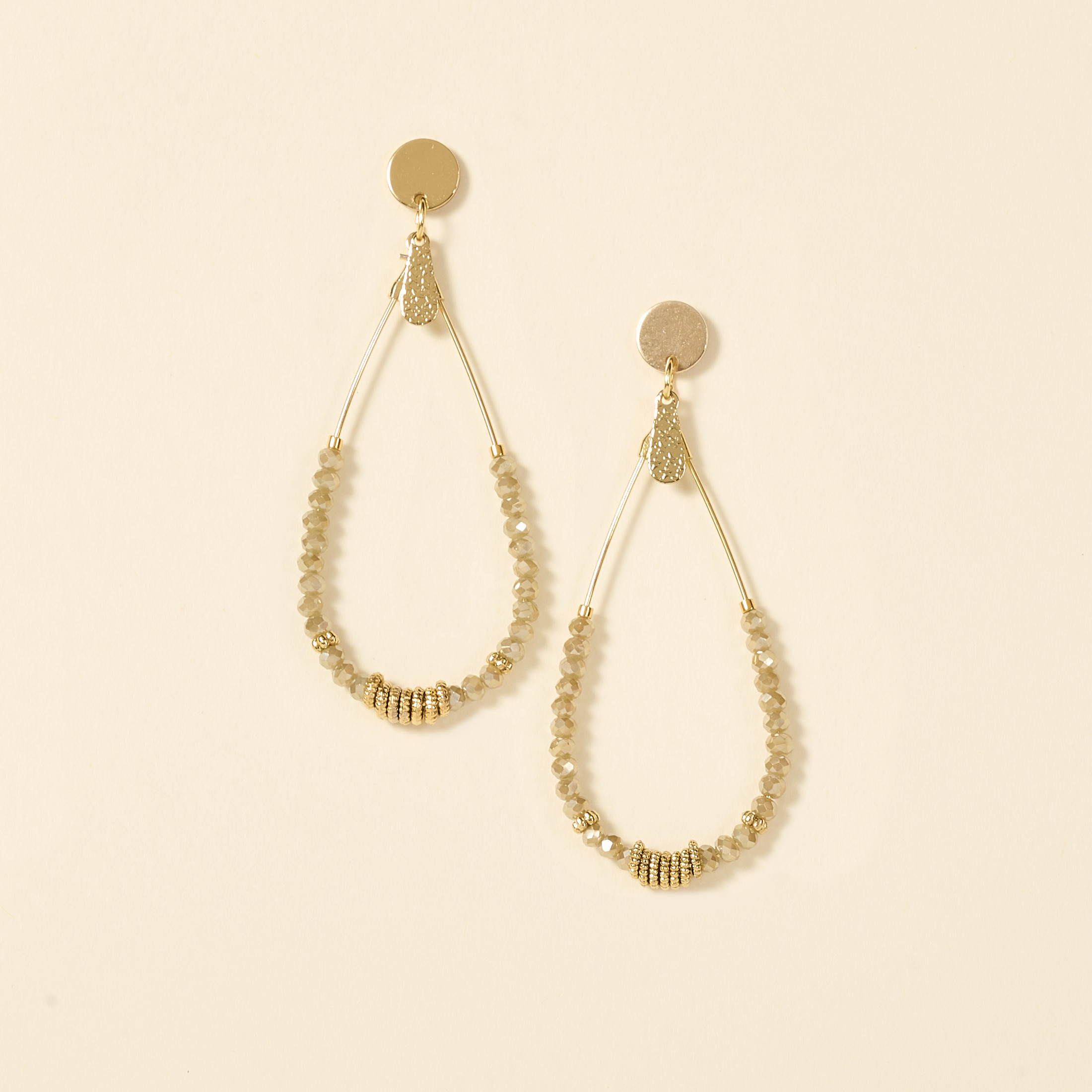 Les boucles d’oreilles Bory séduisent par leur allure élégante et leur éclat raffiné. Dorées à l’or fin, elles se composent d’un anneau en forme de goutte de 5 cm orné de perles en cristal facettées, qui captent la lumière à chaque mouvement.