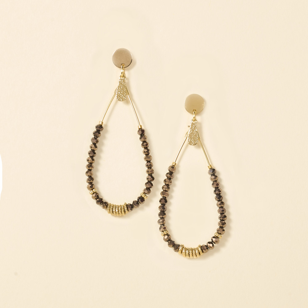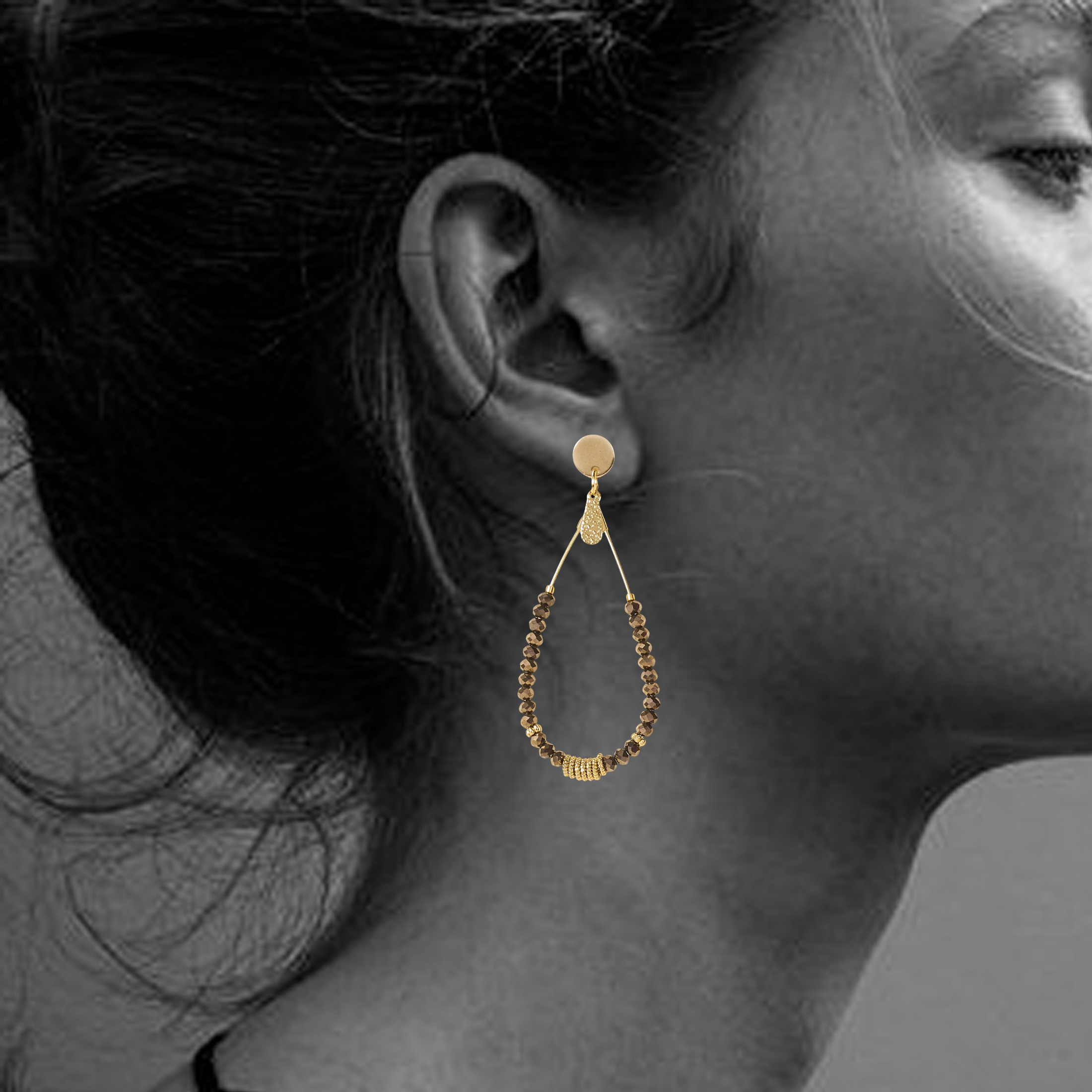 Les boucles d’oreilles Bory séduisent par leur allure élégante et leur éclat raffiné. Dorées à l’or fin, elles se composent d’un anneau en forme de goutte de 5 cm orné de perles en cristal facettées, qui captent la lumière à chaque mouvement.