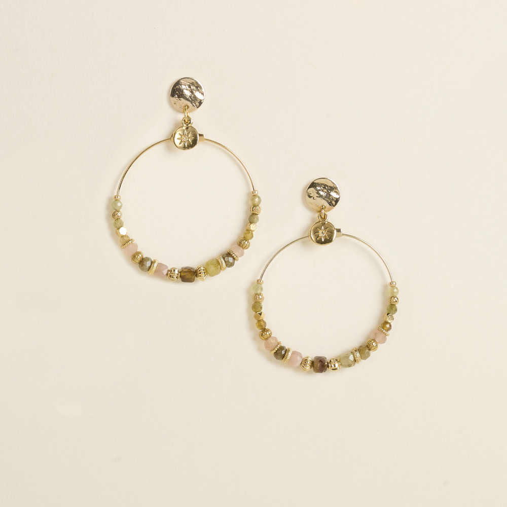 Les boucles d'oreilles Boye, pièce iconique au charme solaire, incarnent l’esprit raffiné et audacieux de notre maison. Elles mêlent avec élégance pierres fines telles que : grenat vert, pierre de lune pêche, citrine et perles dorées aux formes variées, délicatement montées sur un anneau rond de 4 cm de diamètre.