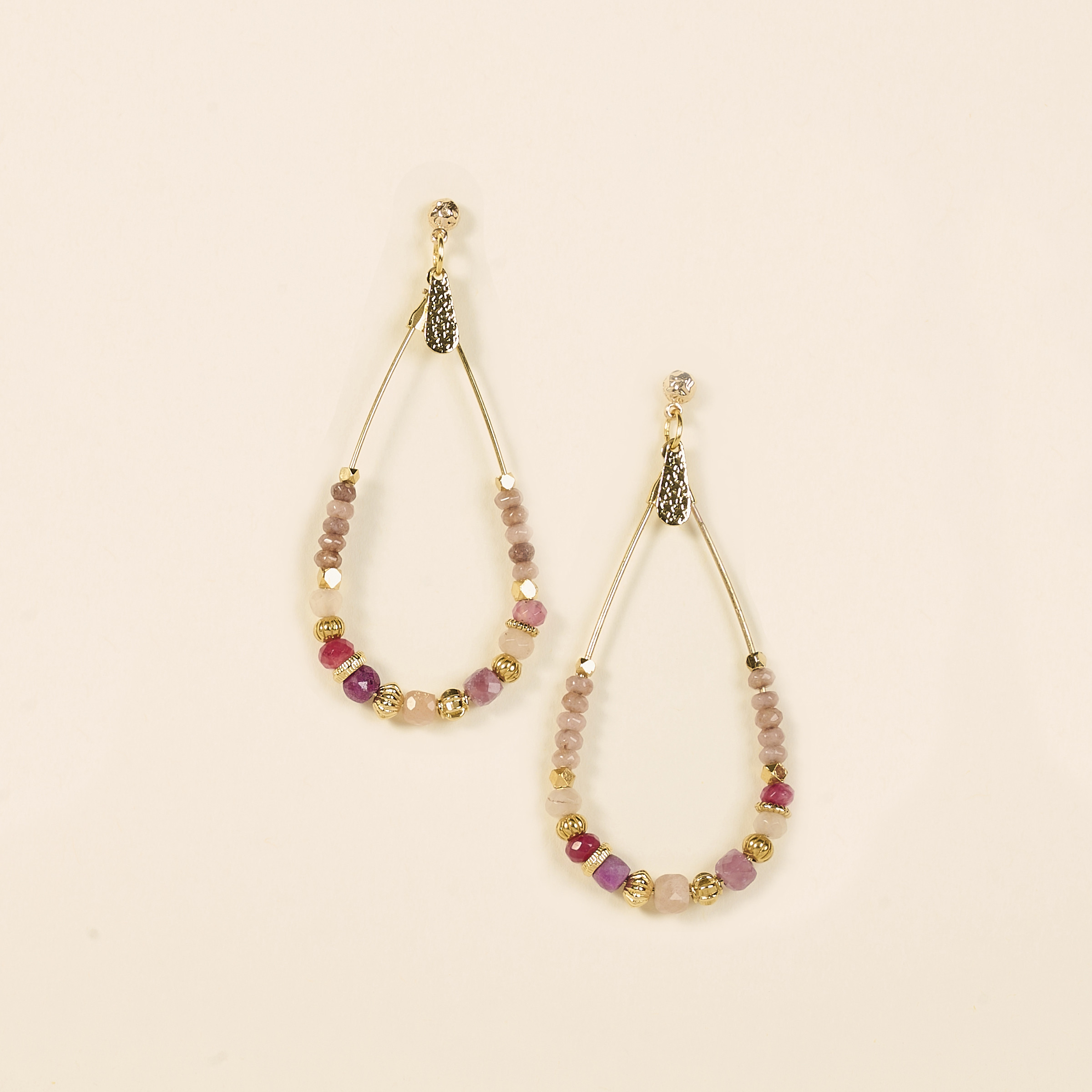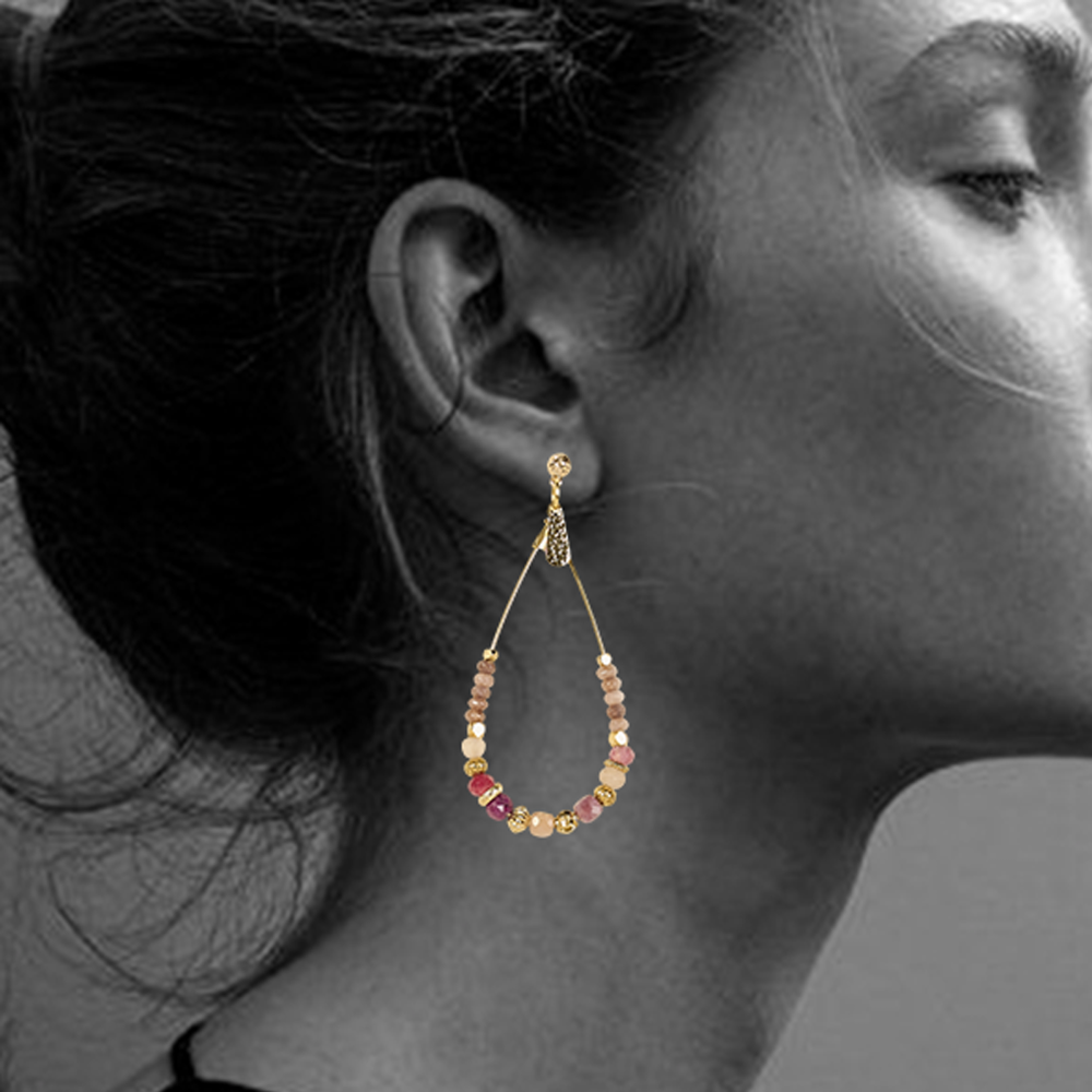 Les boucles d'oreilles Bria, pièce iconique au charme solaire, incarnent l’esprit raffiné et audacieux de notre maison. Elles mêlent avec élégance pierres fines telles que : pierre de lune, tourmaline rose, quartz cherry et perles dorées aux formes variées, délicatement montées sur un anneau en forme de goutte de 5 cm de hauteur.