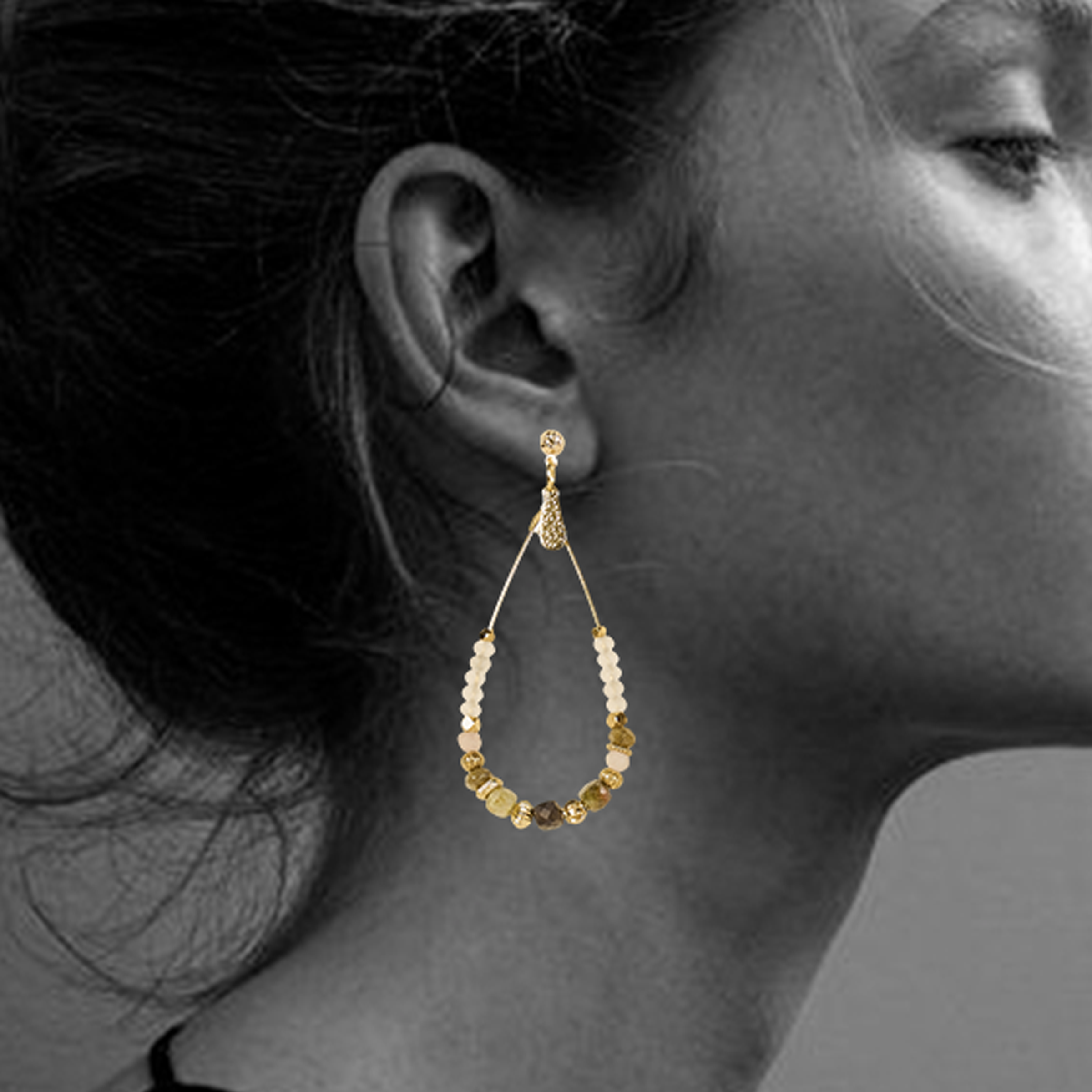 Les boucles d'oreilles Bria, pièce iconique au charme solaire, incarnent l’esprit raffiné et audacieux de notre maison. Elles mêlent avec élégance pierres fines telles que : labradorite, obsidienne, grenat vert et perles dorées aux formes variées, délicatement montées sur un anneau en forme de goutte de 5 cm de hauteur.