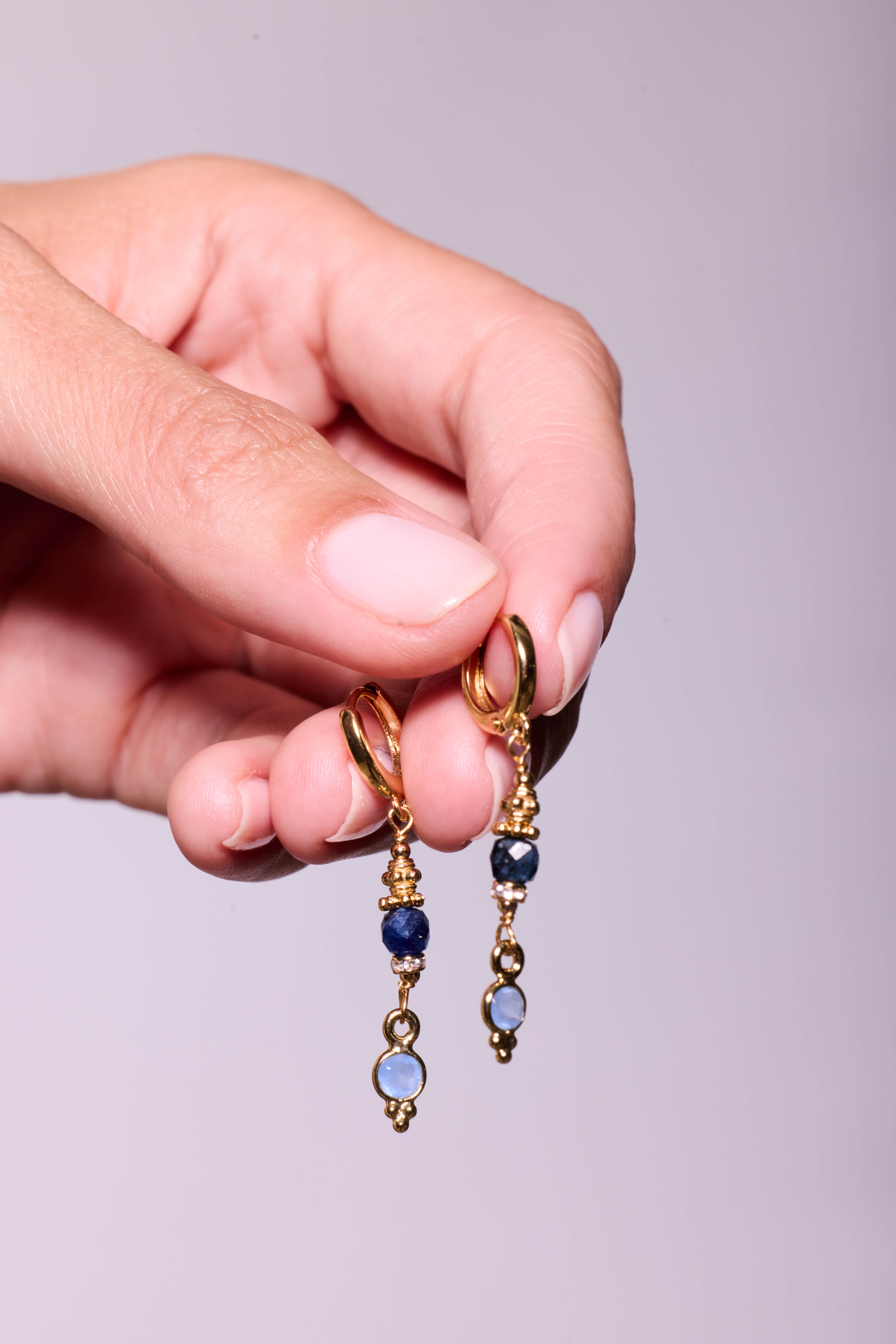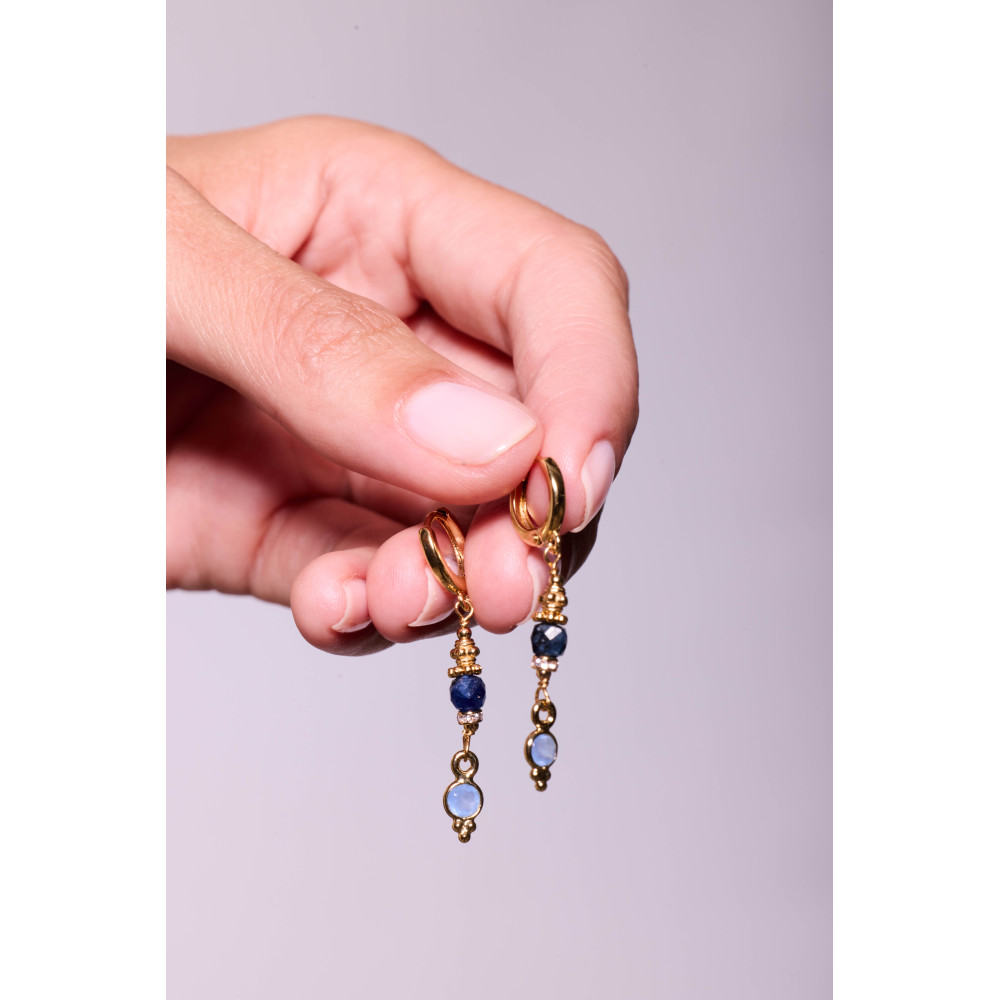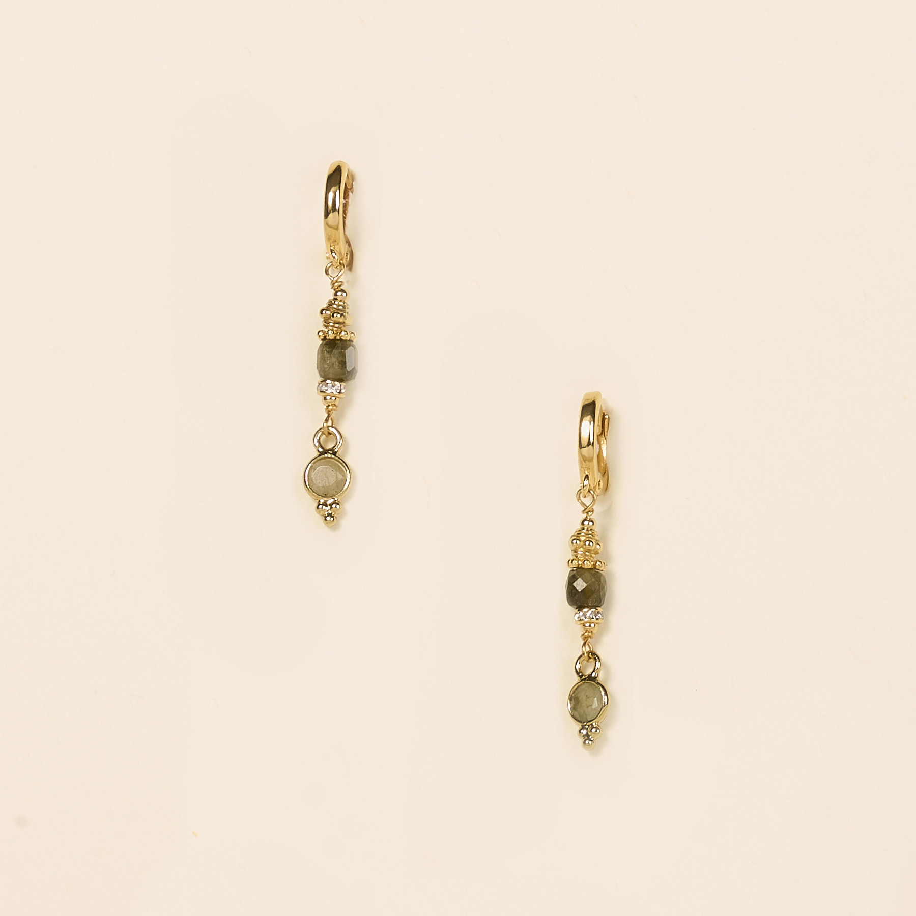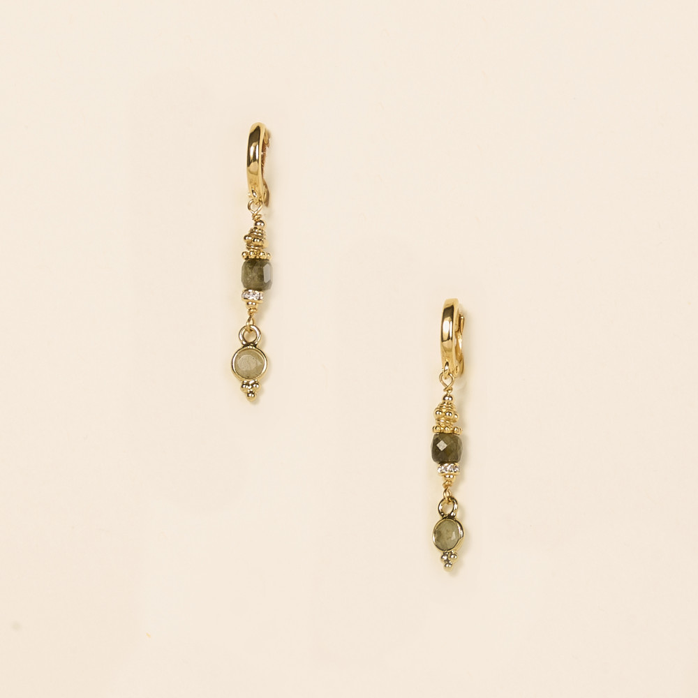 Les boucles d’oreilles Cati séduisent par leur équilibre parfait entre modernité et délicatesse. Elles associent deux pierres fines distinctes : une obsidienne taillée en cube facetté, une labradorite sertie clos et suspendue à l’extrémité pour créer un jeu de formes et de reflets harmonieux.