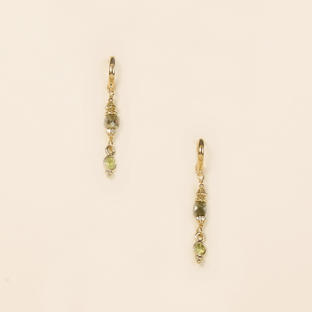 Les boucles d’oreilles Cati séduisent par leur équilibre parfait entre modernité et délicatesse. Elles associent deux pierres fines distinctes : du grenat vert taillé en cube facetté, un grenat vert sertie clos et suspendue à l’extrémité pour créer un jeu de formes et de reflets harmonieux.