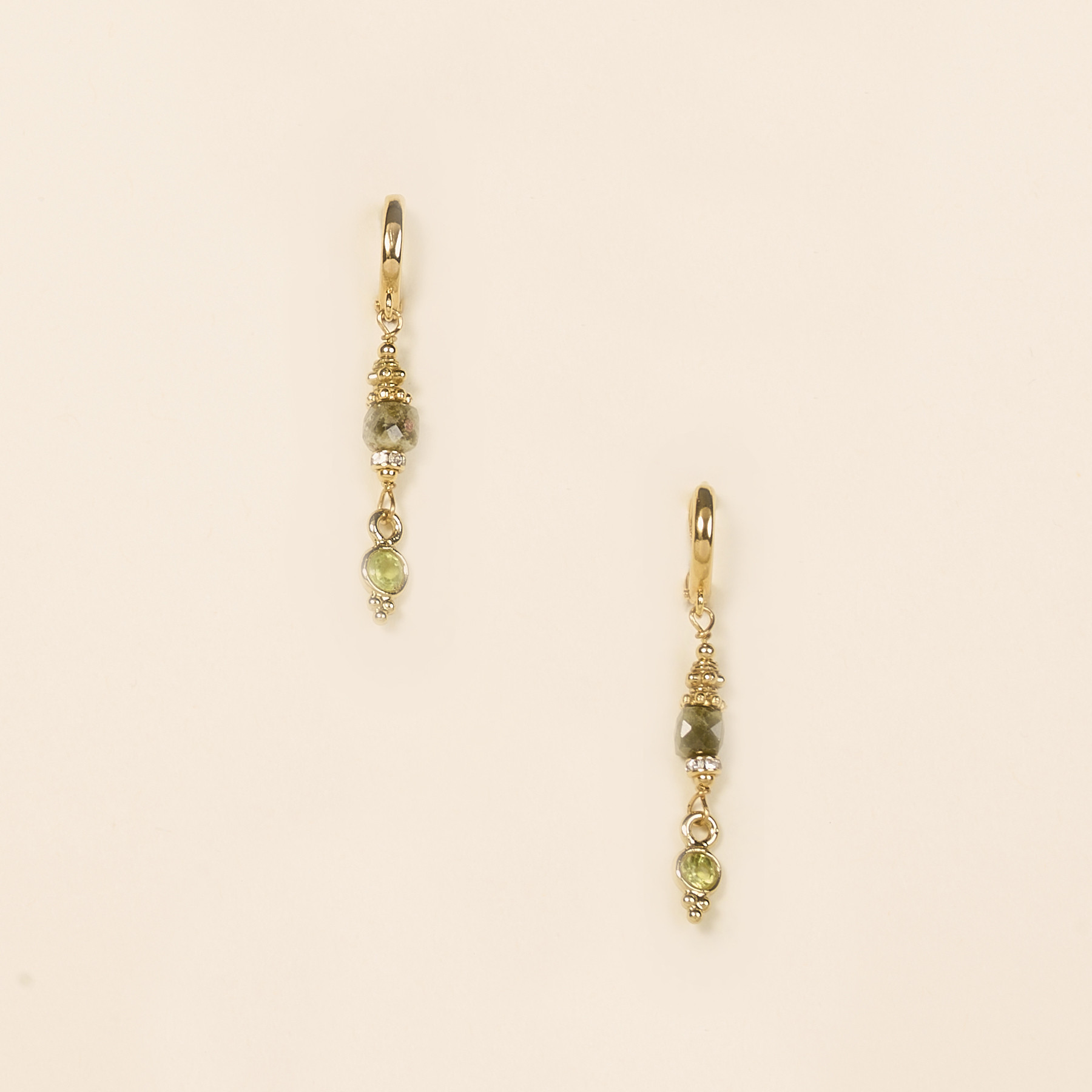Les boucles d’oreilles Cati séduisent par leur équilibre parfait entre modernité et délicatesse. Elles associent deux pierres fines distinctes : du grenat vert taillé en cube facetté, un grenat vert sertie clos et suspendue à l’extrémité pour créer un jeu de formes et de reflets harmonieux.