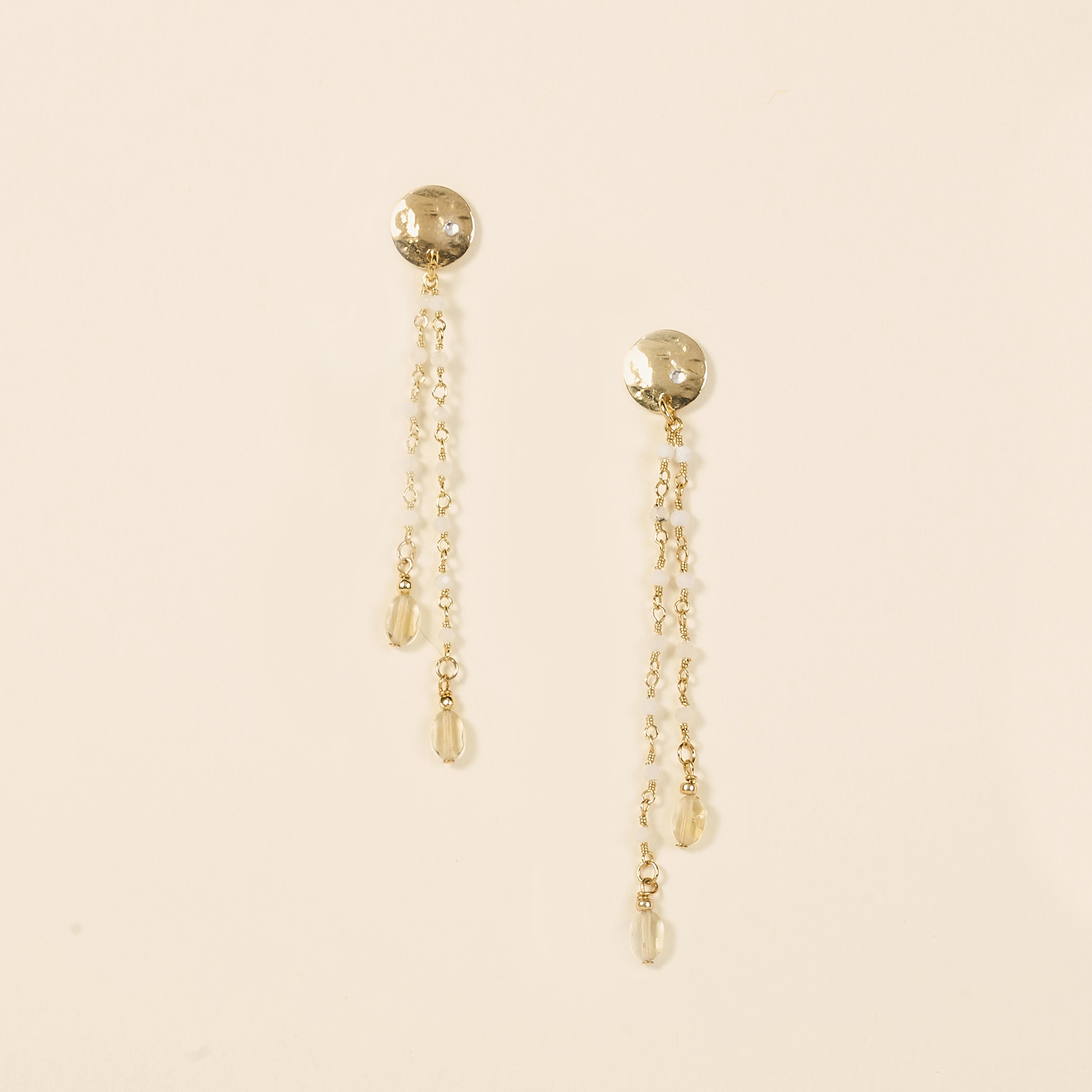 Elles associent avec délicatesse une chaîne de rosaire en pierre de lune blanche à une médaille clou subtilement martelée, rehaussée de pierres ovales en citrine. Un jeu de textures et de lumière qui capte le regard.