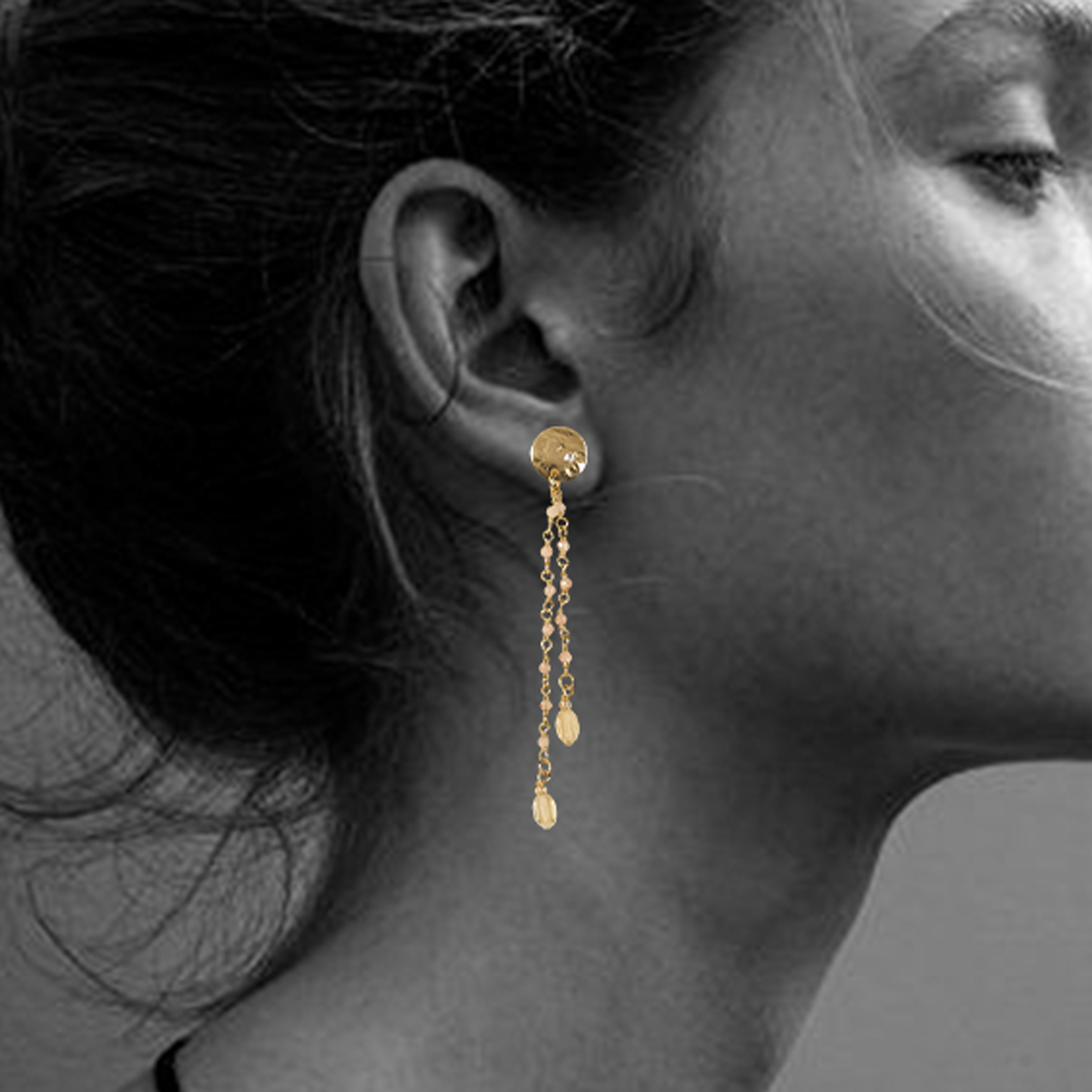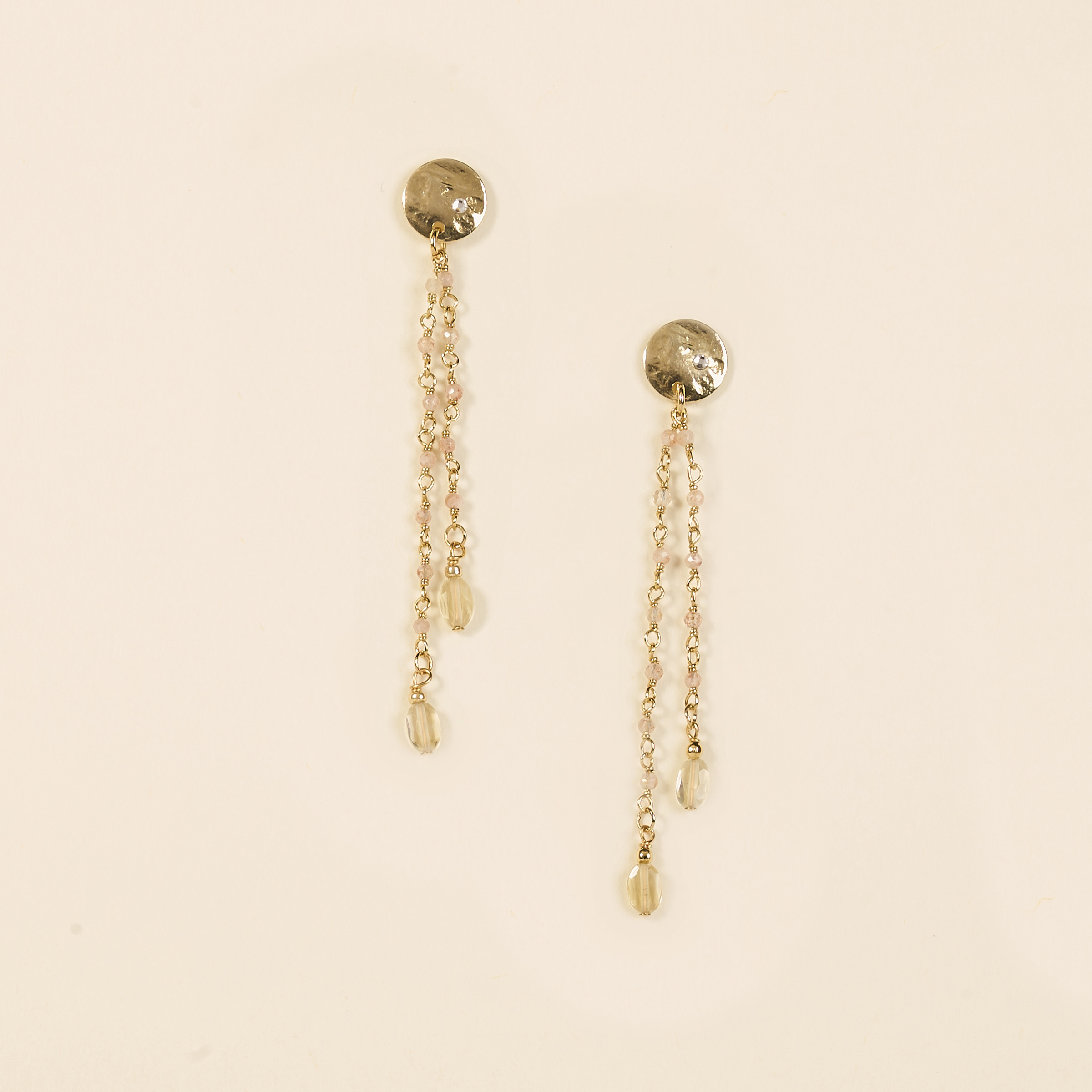 Elles associent avec délicatesse une chaîne de rosaire en pierre de lune pêche à une médaille clou subtilement martelée, rehaussée de pierres ovales en citrine. Un jeu de textures et de lumière qui capte le regard.