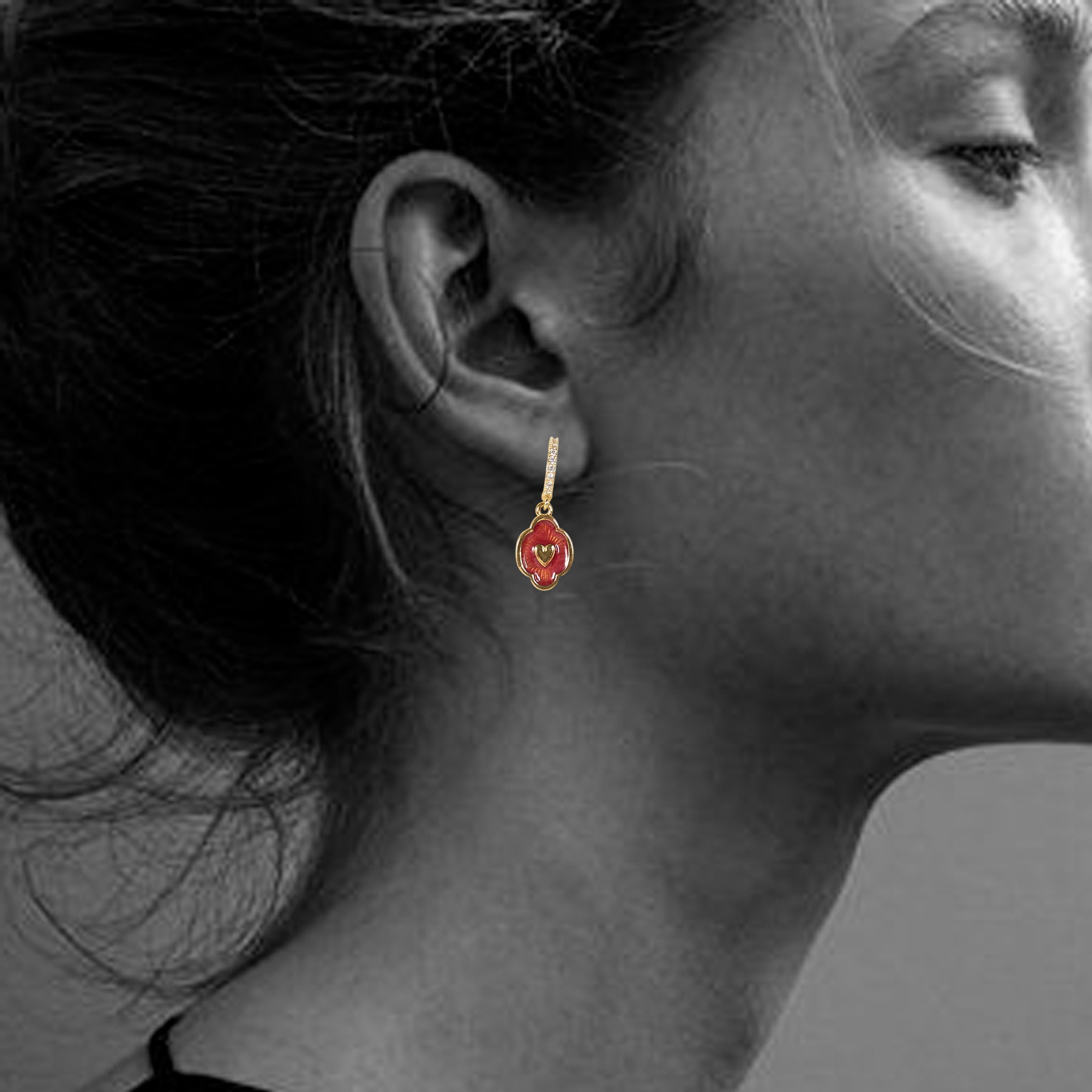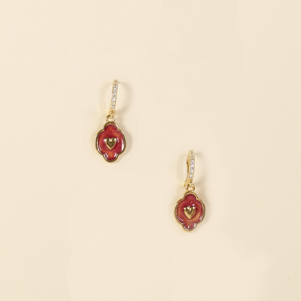 Les boucles d’oreilles Iker se composent d’une dormeuse sertie d’un oxyde de zirconium et d’une médaille arrondie, ornée en son centre d’un cœur en relief entouré de rayons. Le pourtour du cœur est émaillé d’un rouge irisé transparent qui laisse apparaître les rayons et apporte une touche subtile de brillance. Mobiles et légères, elles sont agréables à porter au quotidien.