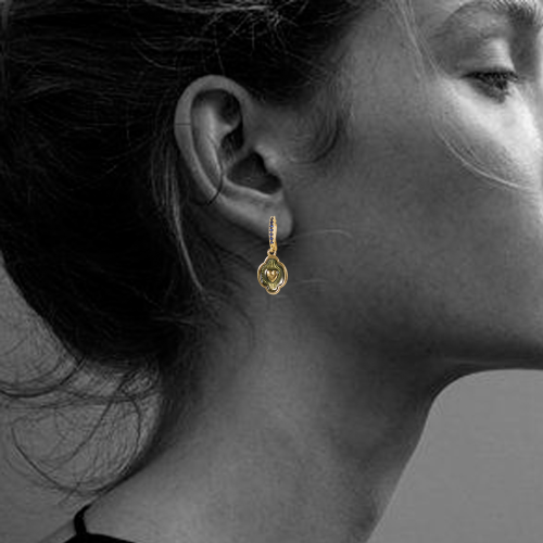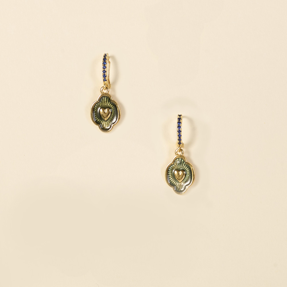 Les boucles d’oreilles Iker se composent d’une dormeuse sertie d’un oxyde de zirconium et d’une médaille arrondie, ornée en son centre d’un cœur en relief entouré de rayons. Le pourtour du cœur est émaillé d’un marine transparent qui laisse apparaître les rayons et apporte une touche subtile de brillance. Mobiles et légères, elles sont agréables à porter au quotidien.